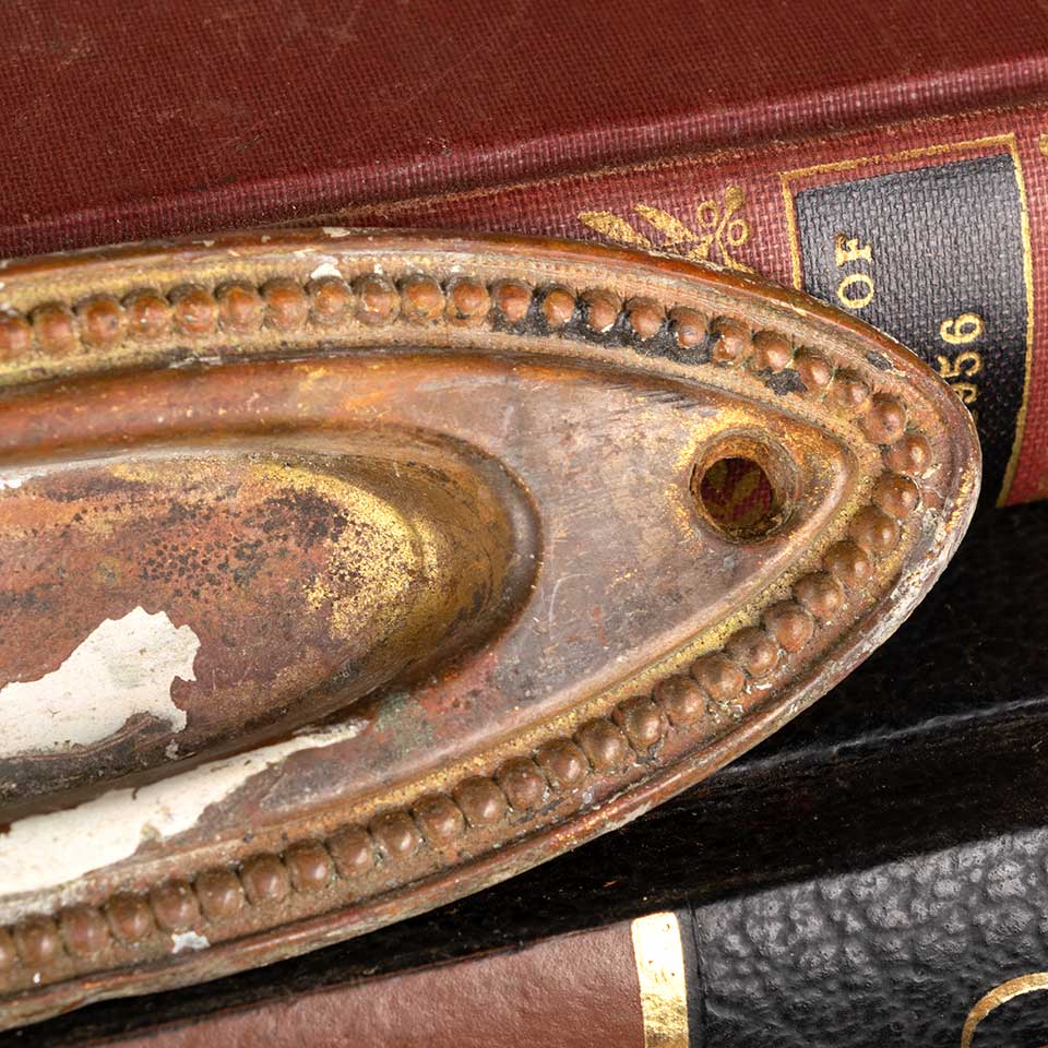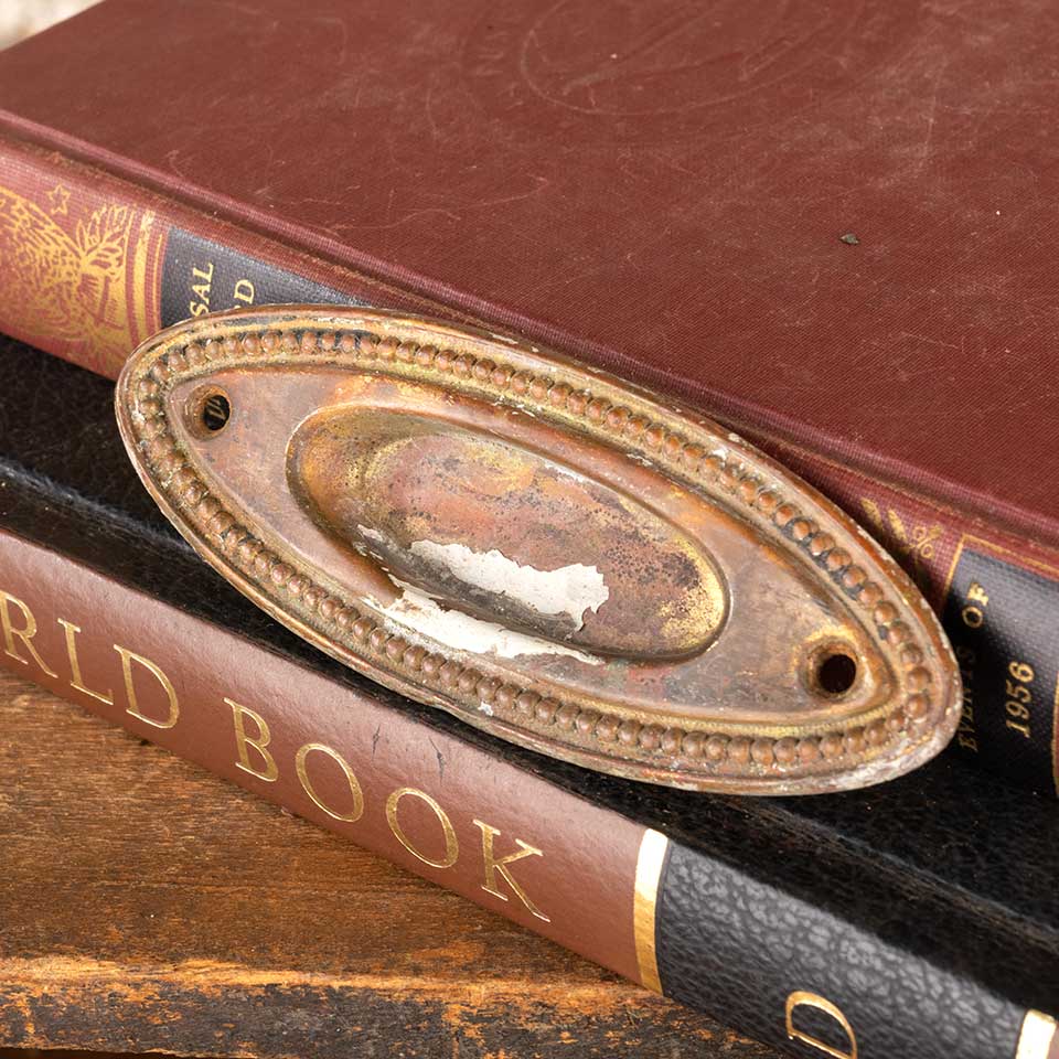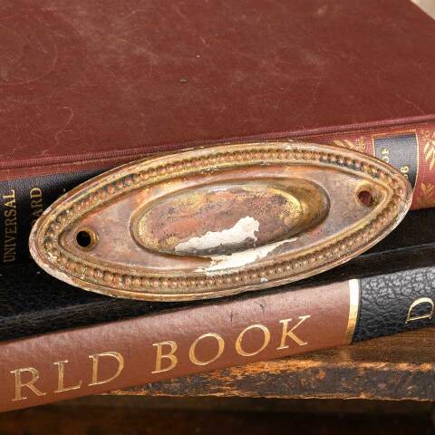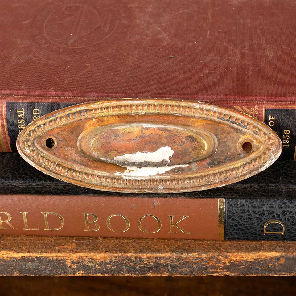 Architectural salvage antique brass oval window sash lift hardware with beaded trim detail measuring approx. 4 1/4" wide x 1 1/2" tall x 1/2" front to back. The recessed area measures approx. 2 1/4" wide x 3/4" tall. See photos to evaluate condition.