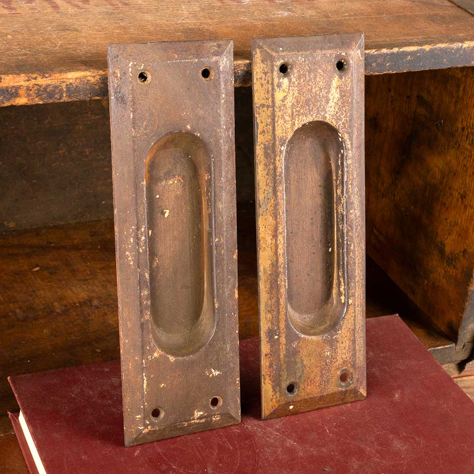 Pair of architectural salvage antique metal pocket door pull handles hardware with beveled edges each measuring approx. 2 1/4" wide x 7 3/8" tall with a recessed area of 1 1/4" x 4". See photos to evaluate condition. Priced at $95 for the pair.