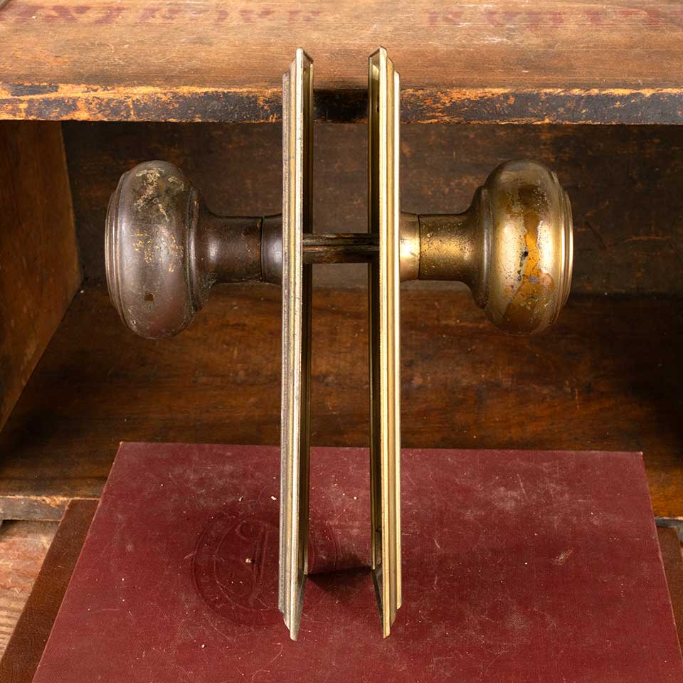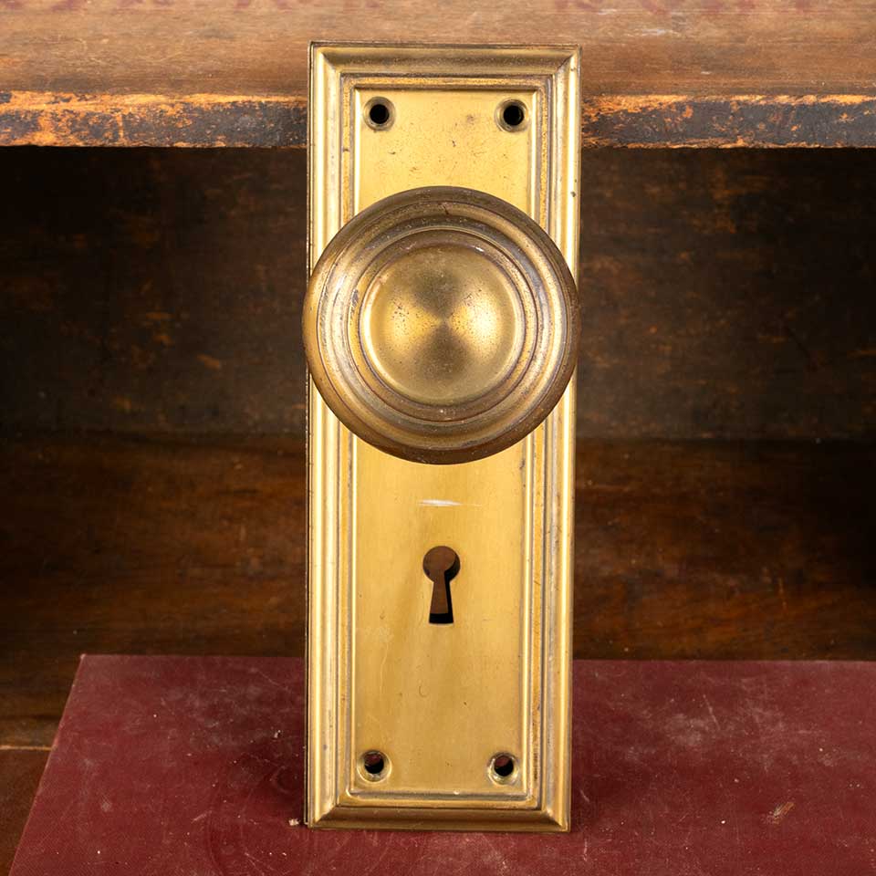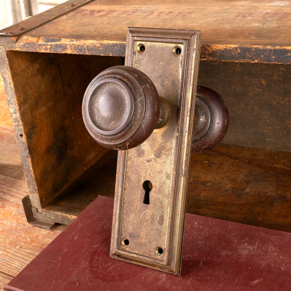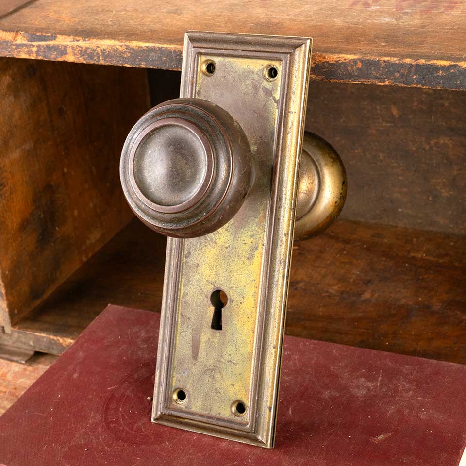 Architectural salvage antique Yale Arts and Crafts metal doorknob door hardware set including a pair of 2 1/4" diameter doorknobs, a pair of 2 1/2" wide x 7 1/4" tall backplates, 3-piece spindle with 1 set screw & 1 pin. Color and condition vary, see photos to evaluate. Priced at $125/set.