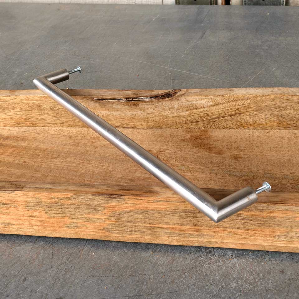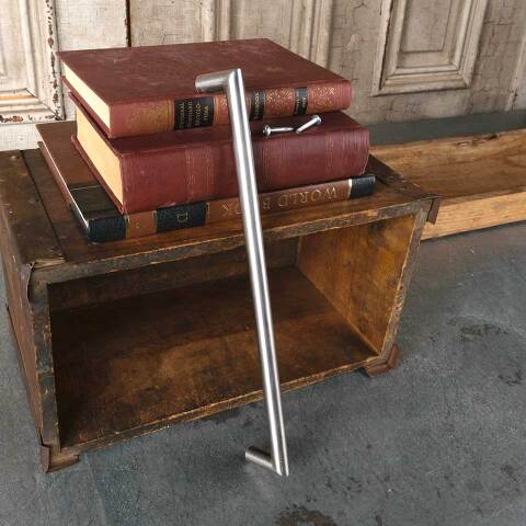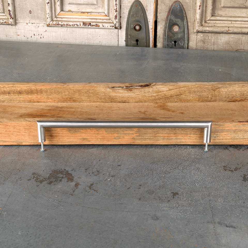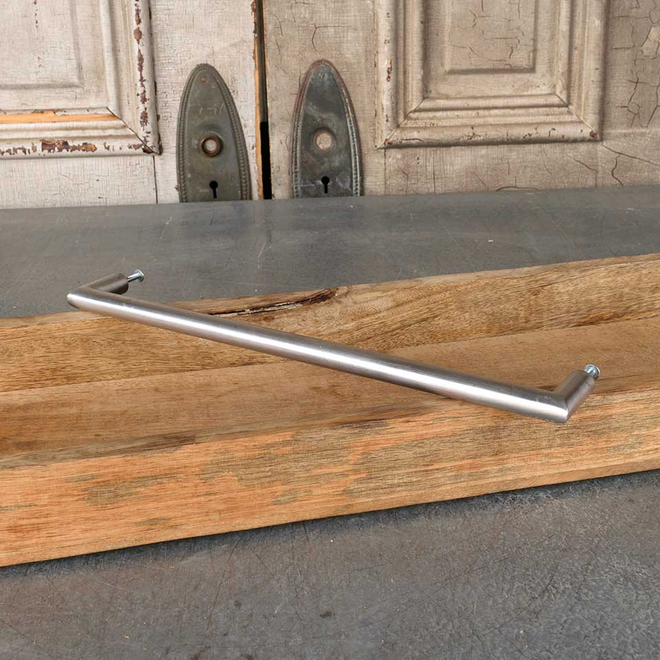 Architectural salvage large nickel door/ furniture handle pull hardware measuring approx. 13 1/4" 5/8" x 3/4". Mounting screws included. Color and condition may vary.