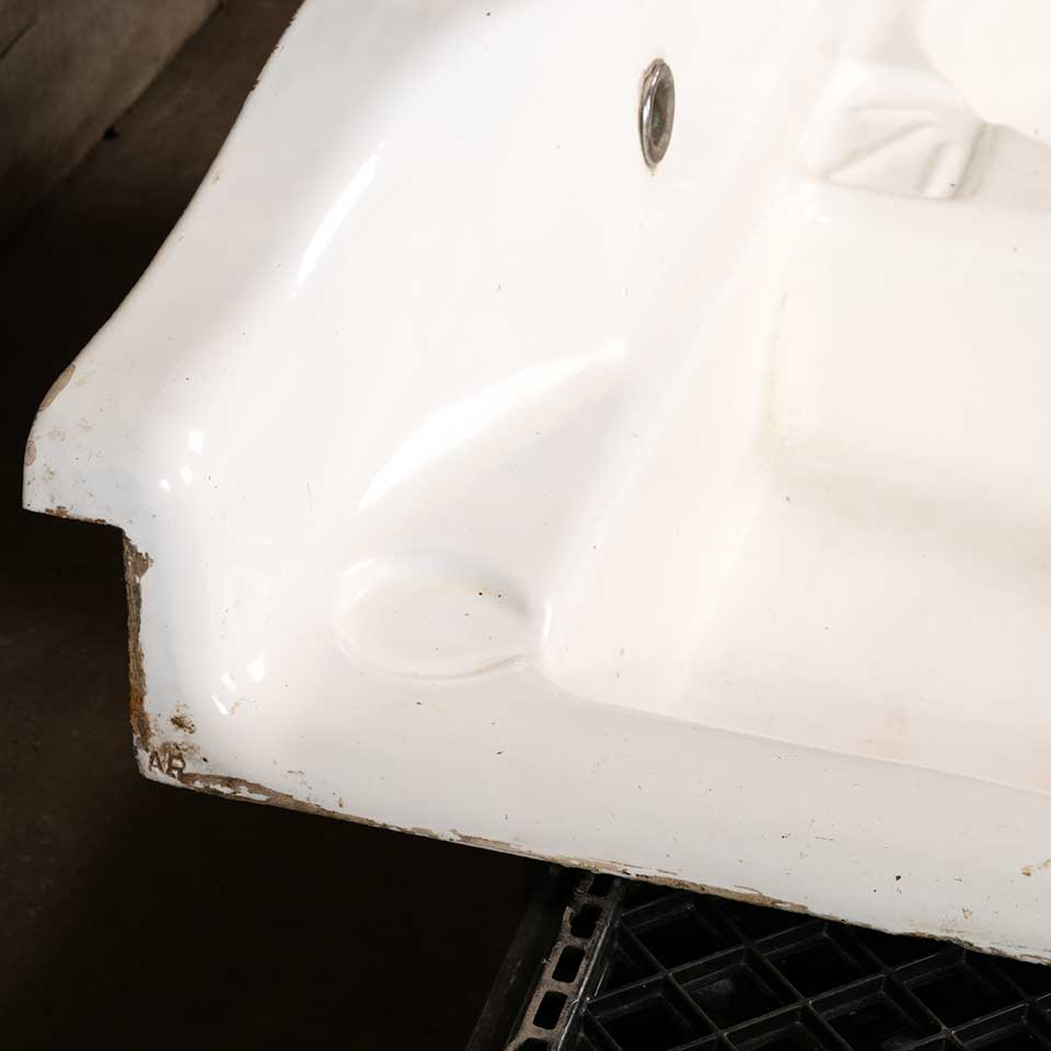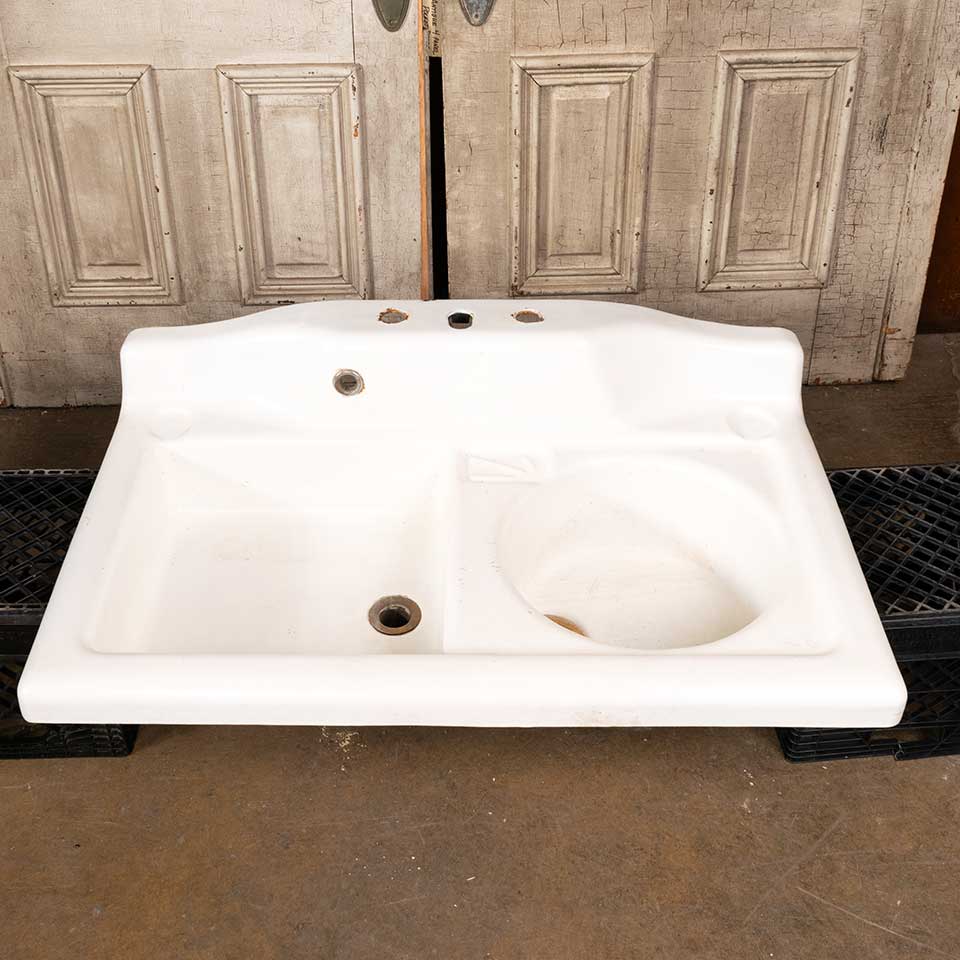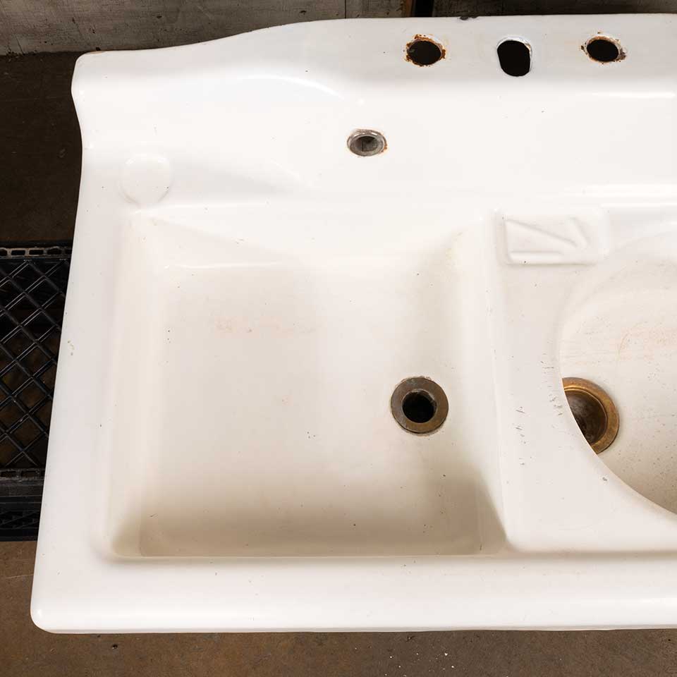 Architectural salvage unique antique cast iron porcelain enameled kitchen sink with square and round bowls measuring approx. 42" wide x 12" tall x 26" front to back. See photos to evaluate condition.
