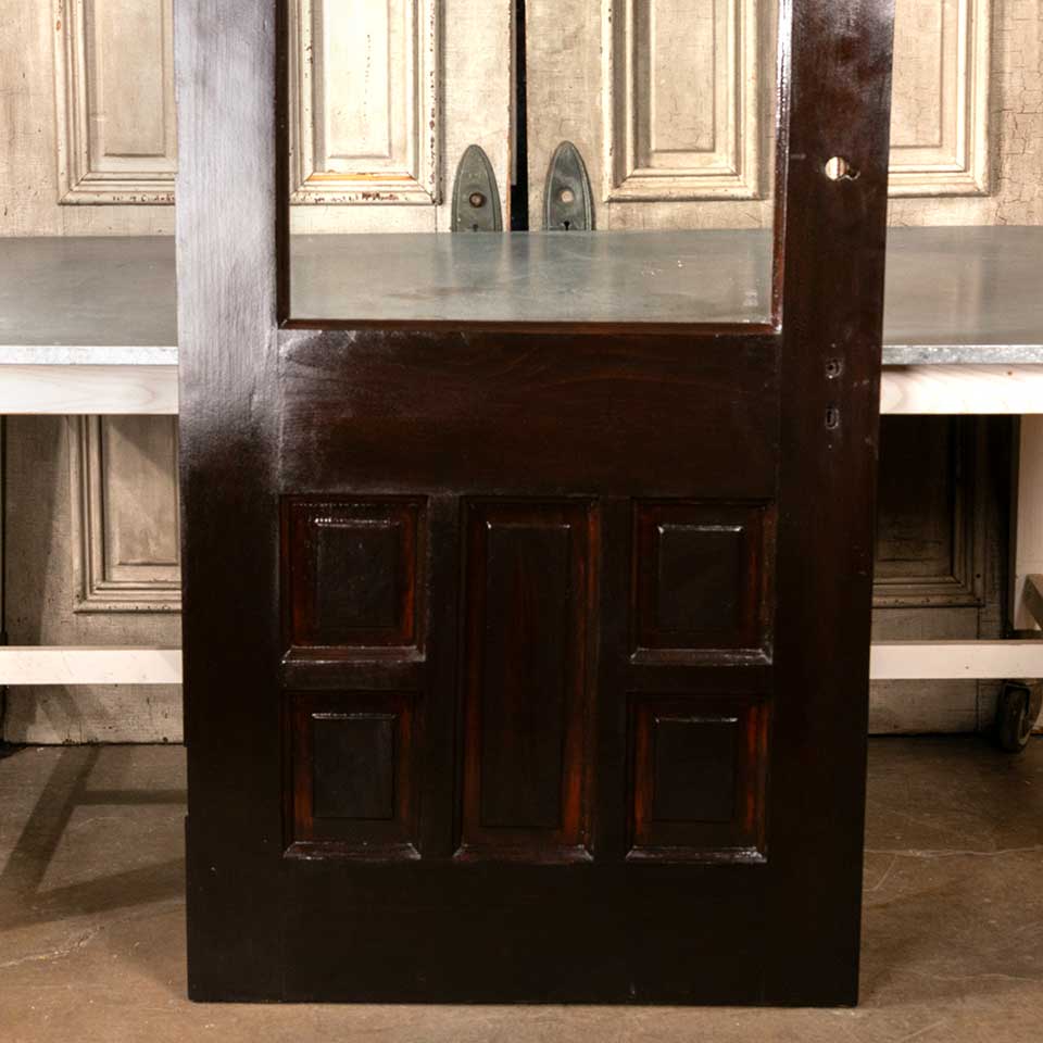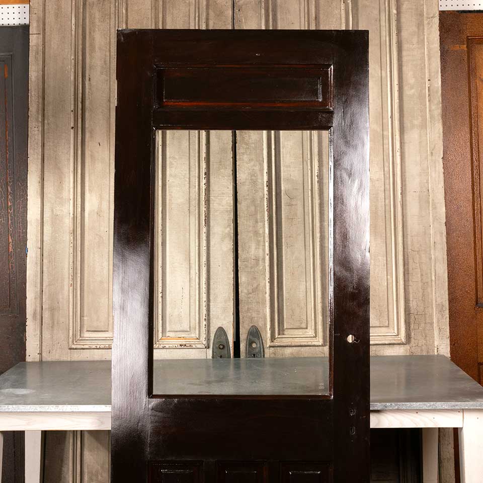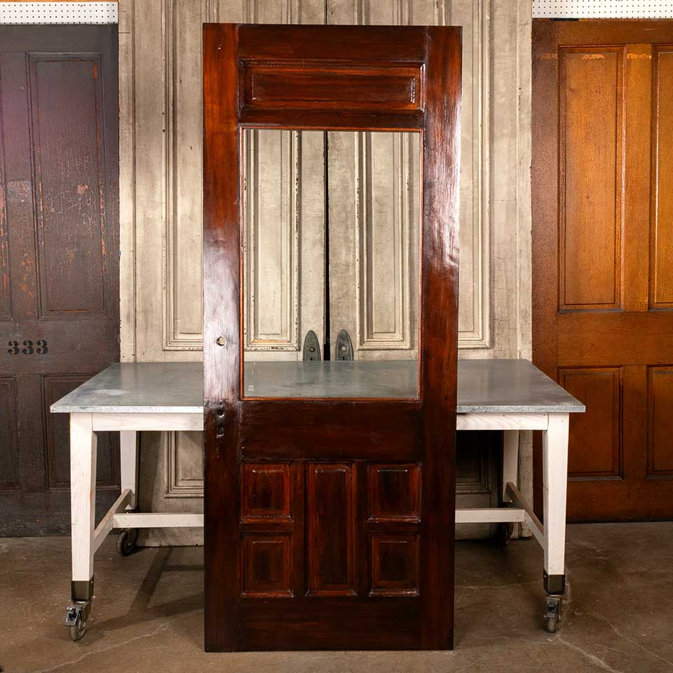 Architectural salvage antique half-lite pine wood entry door with five lower panels measuring approx. 33 3/4" wide x 82 3/4" tall x 1 3/4" thick. The glass is not the original glass. See photos to evaluate condition.