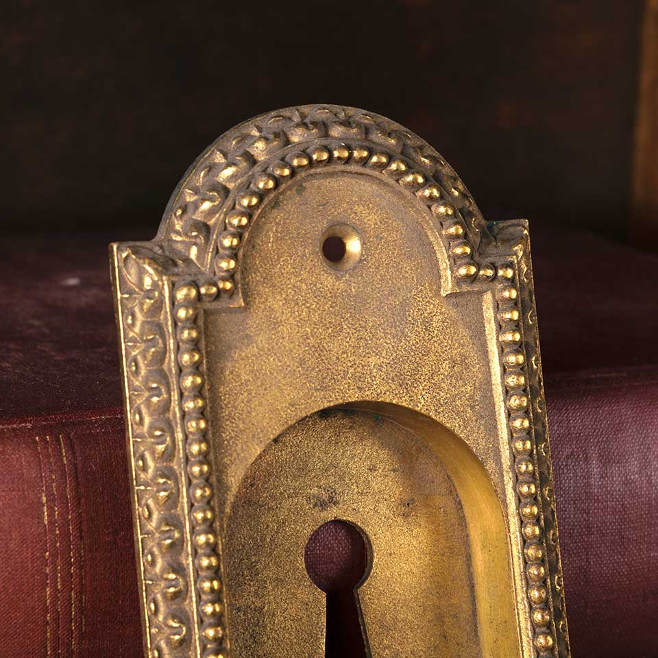 Architectural salvage antique cast brass single pocket door pull handle hardware with an ornate decorative border and keyhole measuring approx. 2 1/2" wide x 6 3/8" tall x 5/8" front to back with a recessed area of 1 3/4" wide x 3 1/4" tall. See photos to evaluate condition.