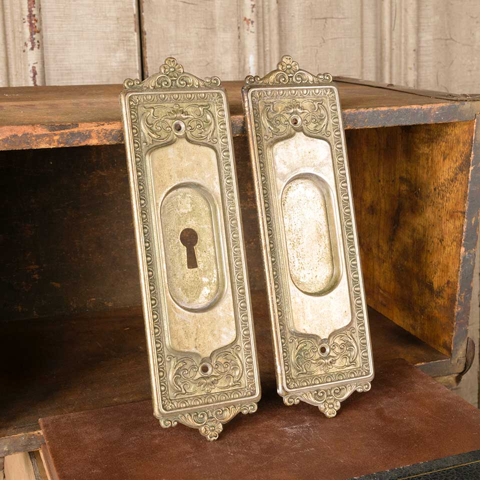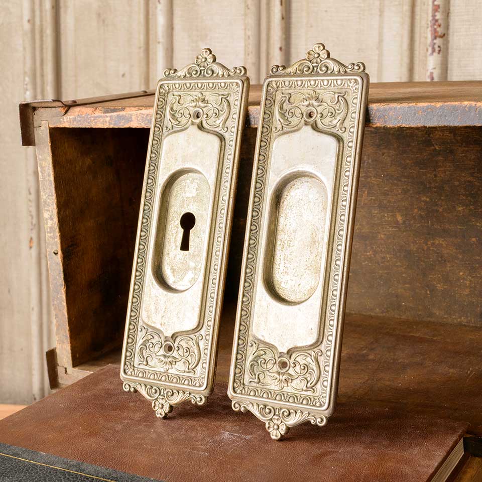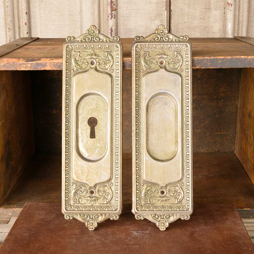 Set of two architectural salvage antique nickel-plated brass Corbin Mantua pattern (c. 1905) pocket door hardware pull handles (one with a keyhole & one without) each measuring approx. 2 5/8" wide x 8 3/4" tall x 1/4" front to back and a recessed area of 1 /3/8" x 3". See photos to evaluate condition. Priced at $175 for the two piece set.