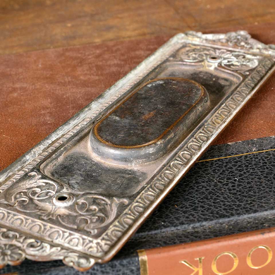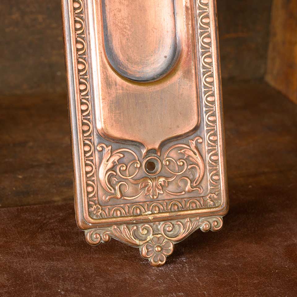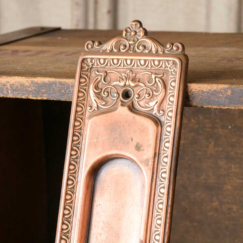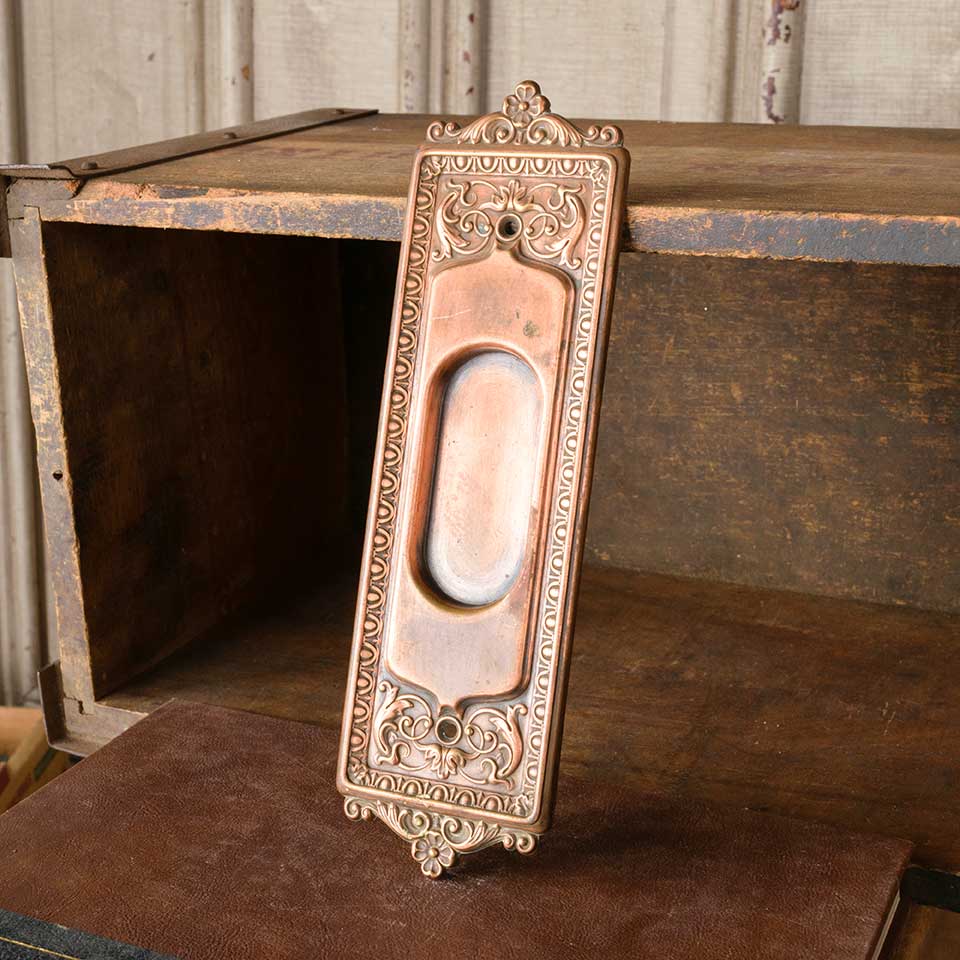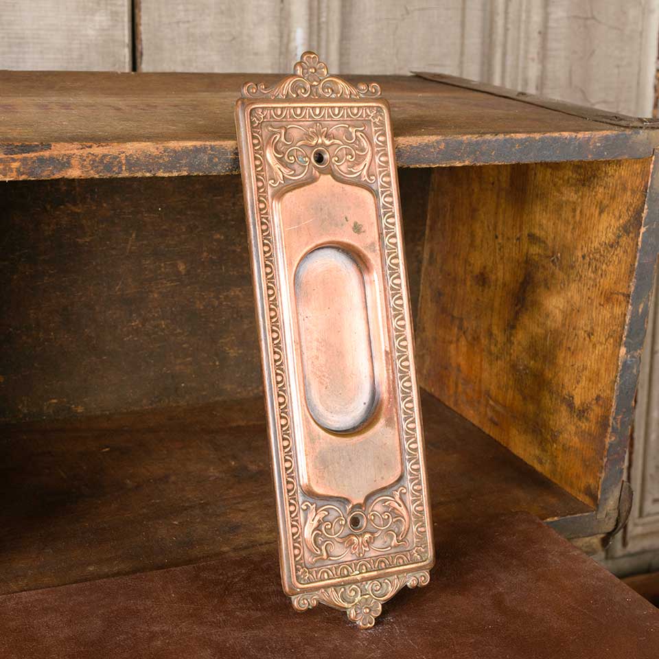 Architectural salvage single antique bronze Corbin Mantua pattern (c. 1905) pocket door pull handle hardware measuring approx. 2 5/8" wide x 8 3/4" tall x 1/4" thick and a recessed area of 1 /3/8" x 3". See photos to evaluate condition.