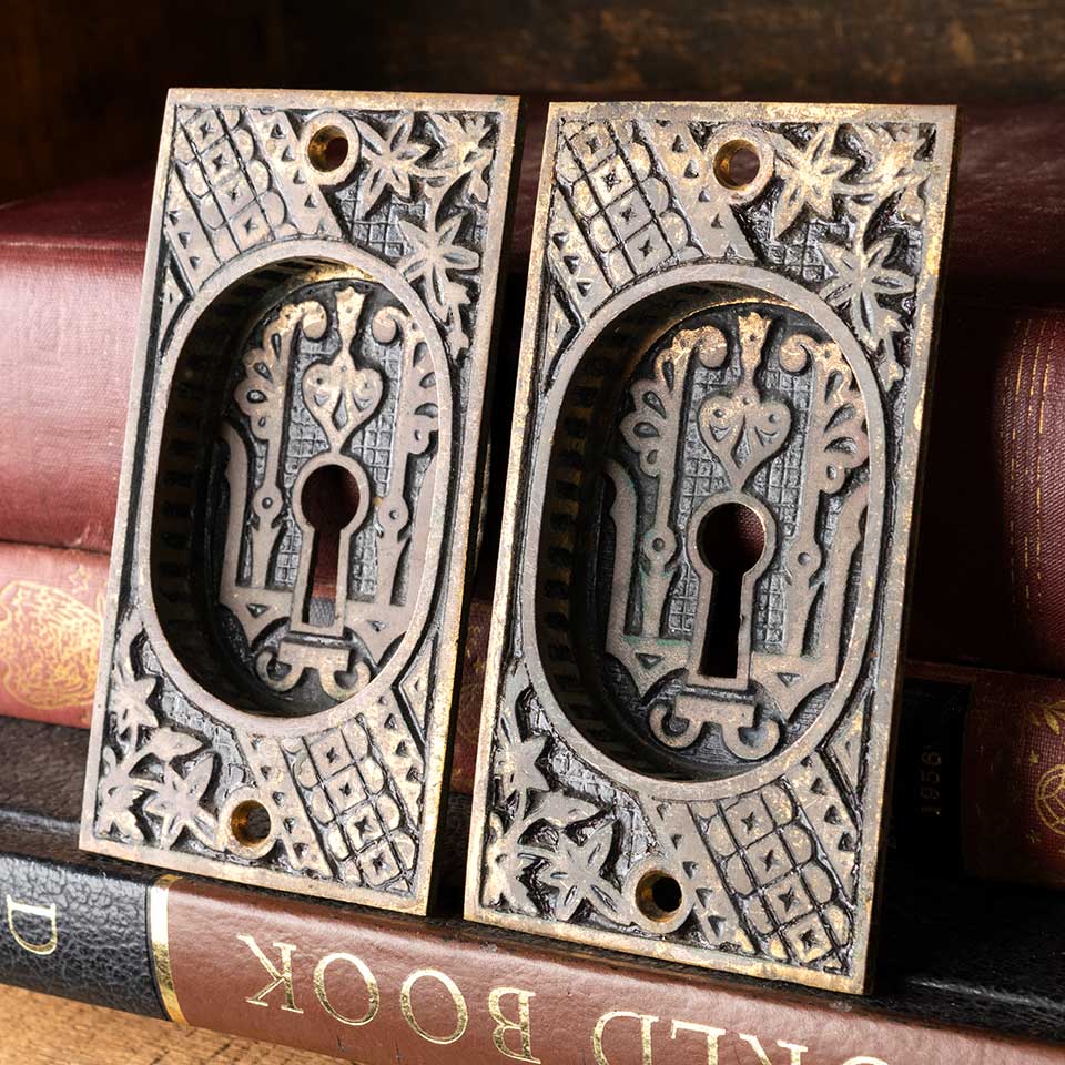 Set of two architectural salvage antique ornate Victorian cast bronze pocket door hardware pull handles with keyholes and Eastlake patterns each measuring approx. 2 1/8" wide x 4" tall x 1/2" front to back with a recessed area of 1 3/4" wide x 2 1/2" tall. See photos to evaluate condition. Priced at $175 for the set of two.