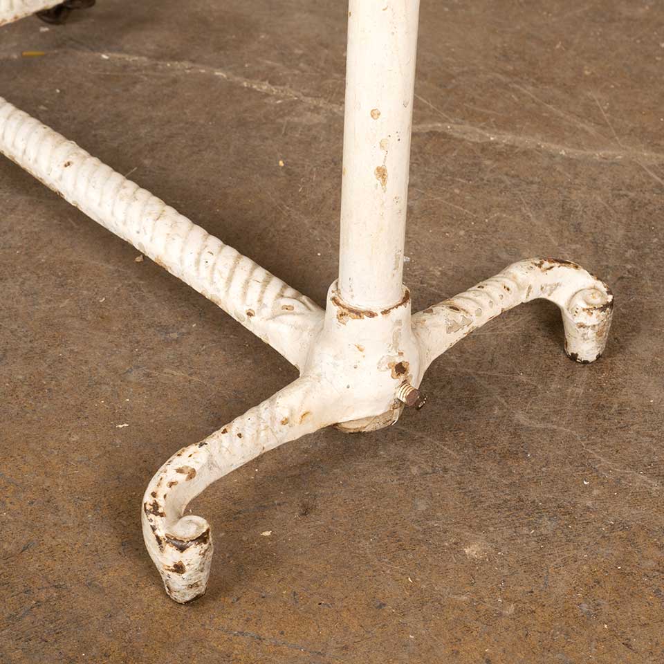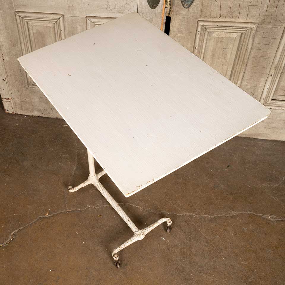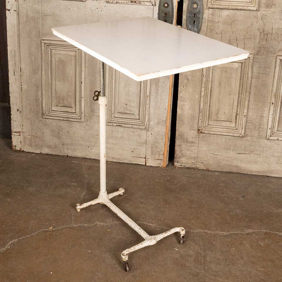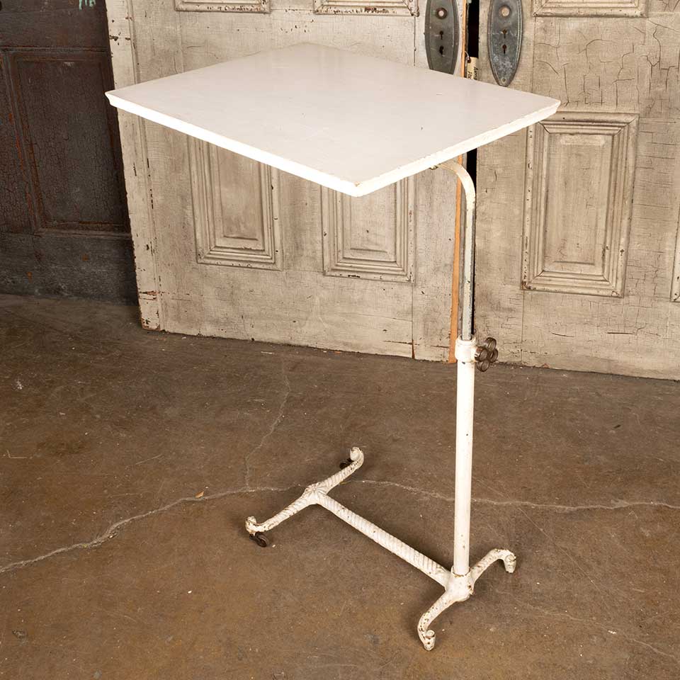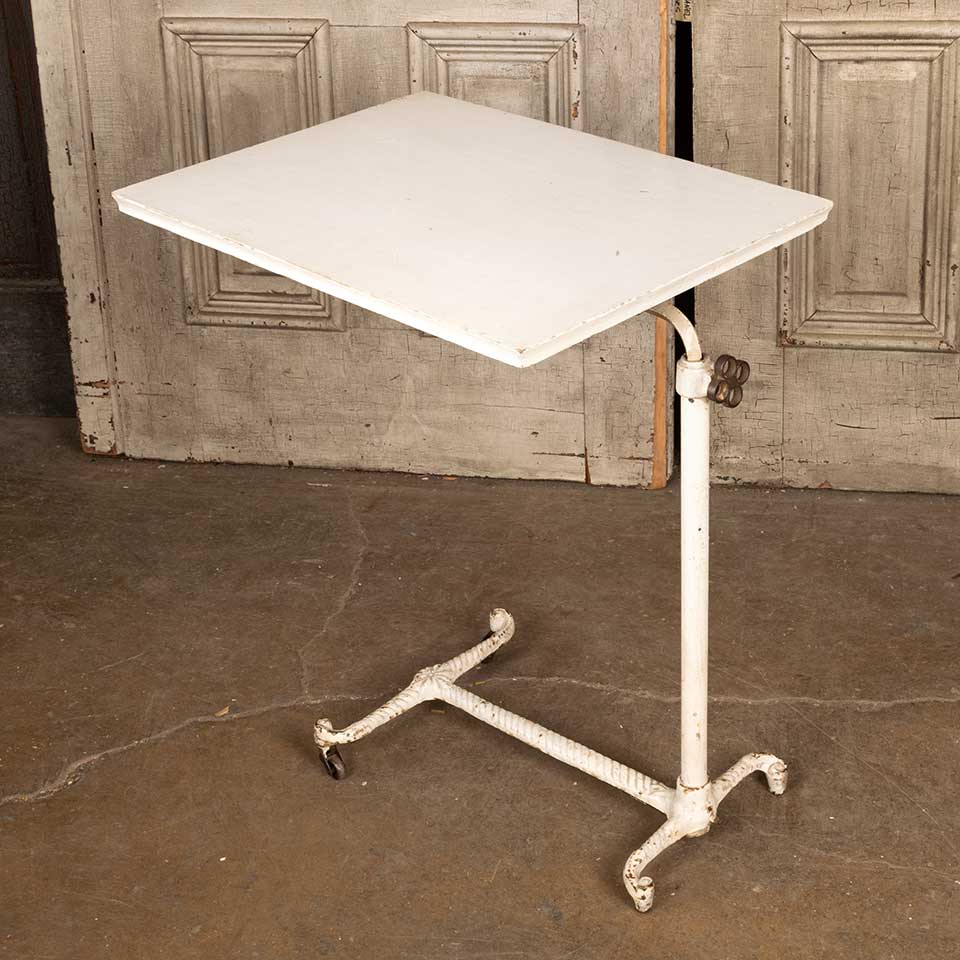 Antique adjustable writing / bed table with painted wood top and cast iron base measuring approx. 25 3/4" x 18" with an adjustable height from 26" to 43". See photos to evaluate condition.