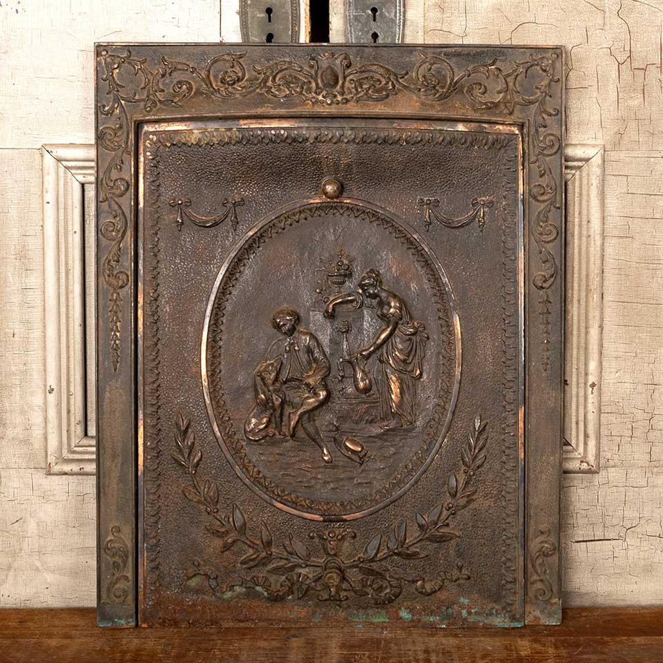 Architectural salvage antique cast iron fireplace surround and summer front cover with figural motif. The surround measures approx. 24 3/8" wide x 30 1/4" tall x 2" front to back and the summer front cover measures approx. 20 1/8" wide x 26 3/8" tall x 1" front to back. There's surface rust at the bottom of the summer front cover. See photos to evaluate condition. Priced at $650 for the 2 piece set.