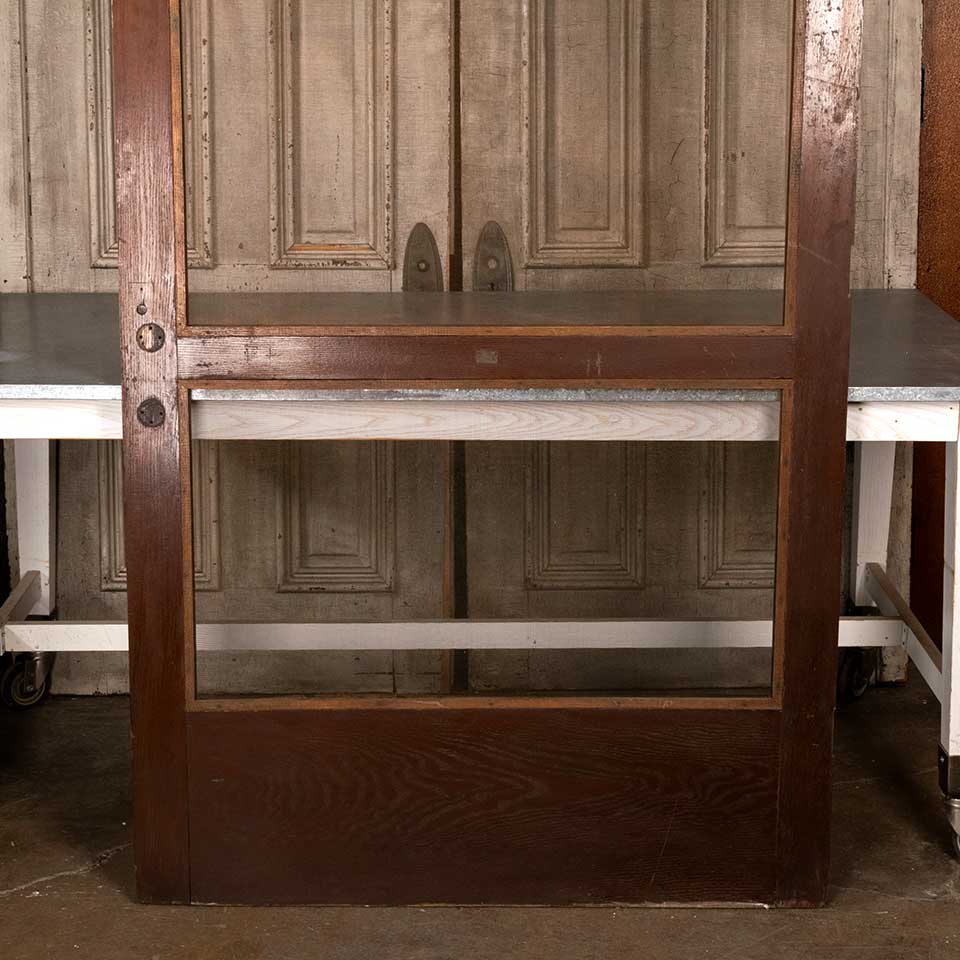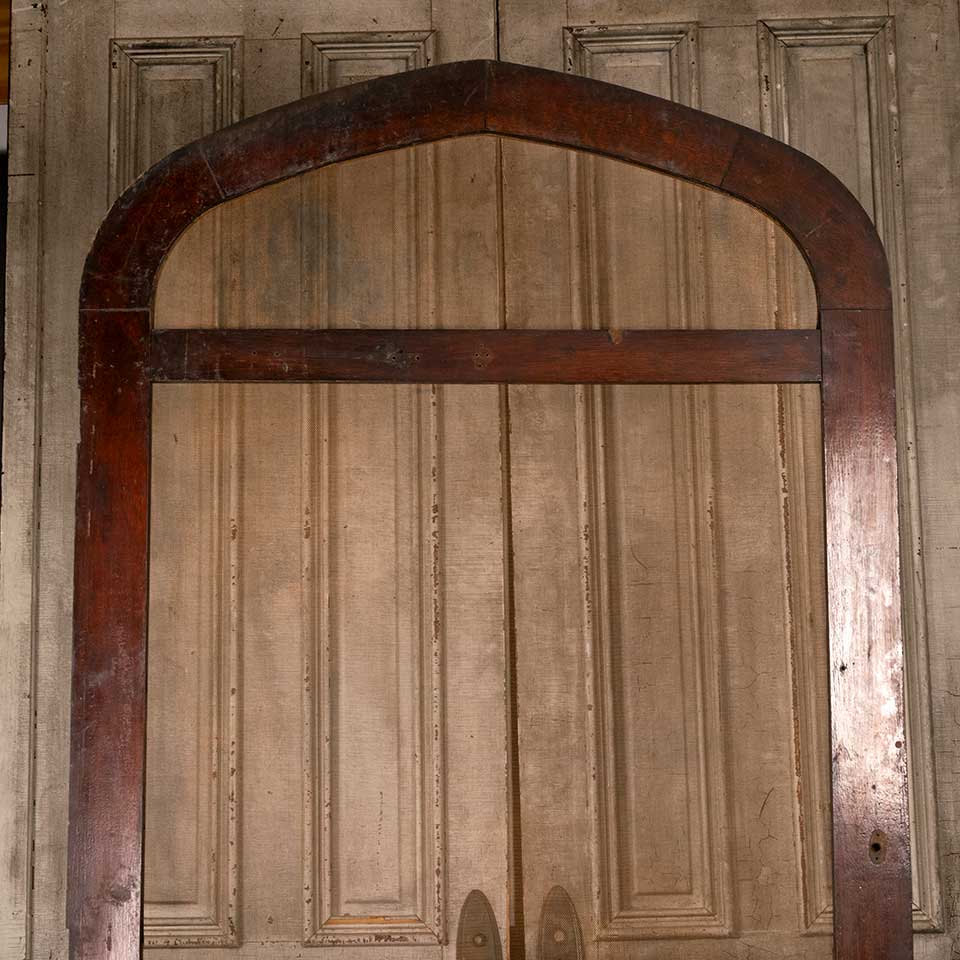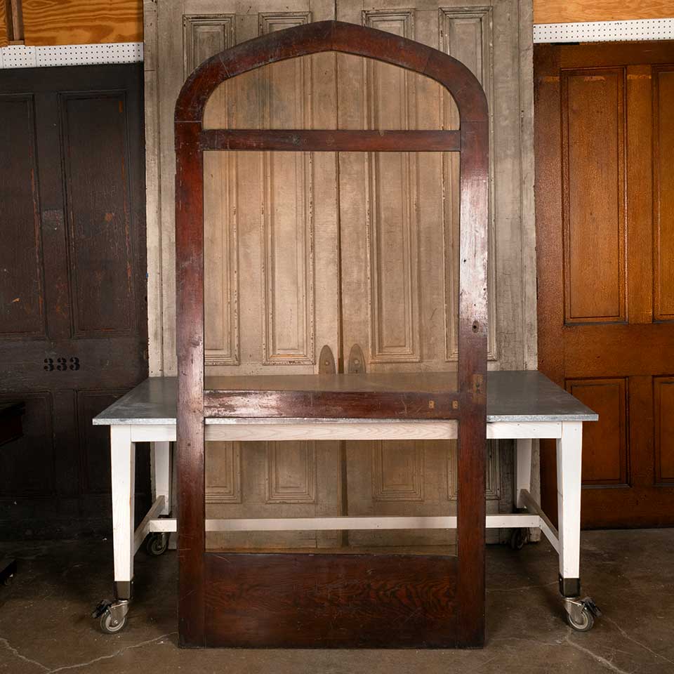 Architectural salvage antique oak wood pointed arch screen door measuring approx. 43 7/8" wide x 88 1/2" tall (at center) x 1 1/8" thick. See photos to evaluate condition.