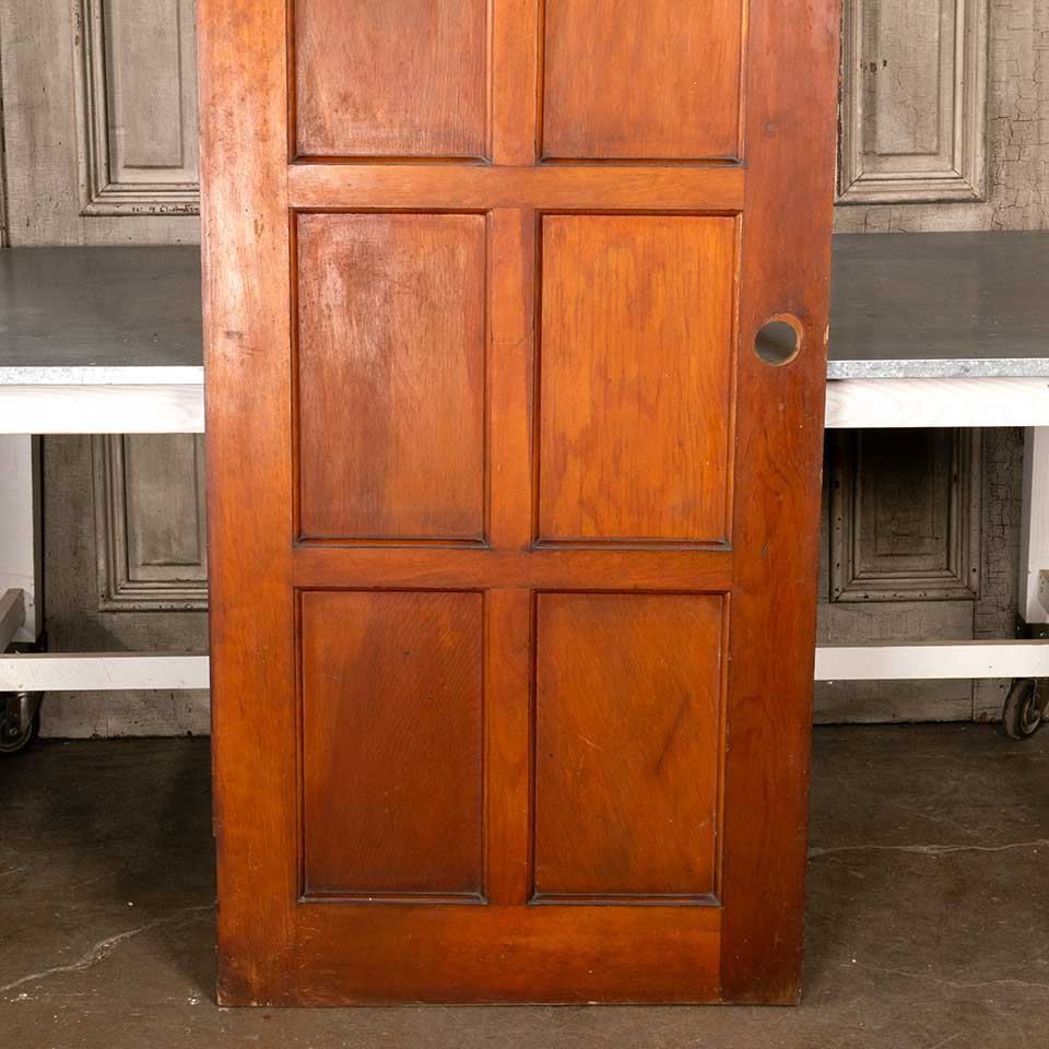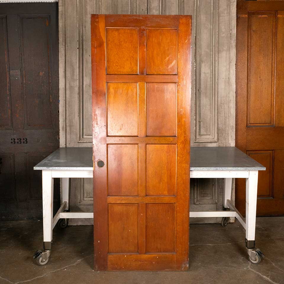 Architectural salvage antique wood eight panel interior door measuring approx. 29 7/8" wide x 79 1/2" tall x 1 3/8" thick. There are some screw holes visible on the door and some wood loss where the mortise lock was located. See photos to evaluate condition.