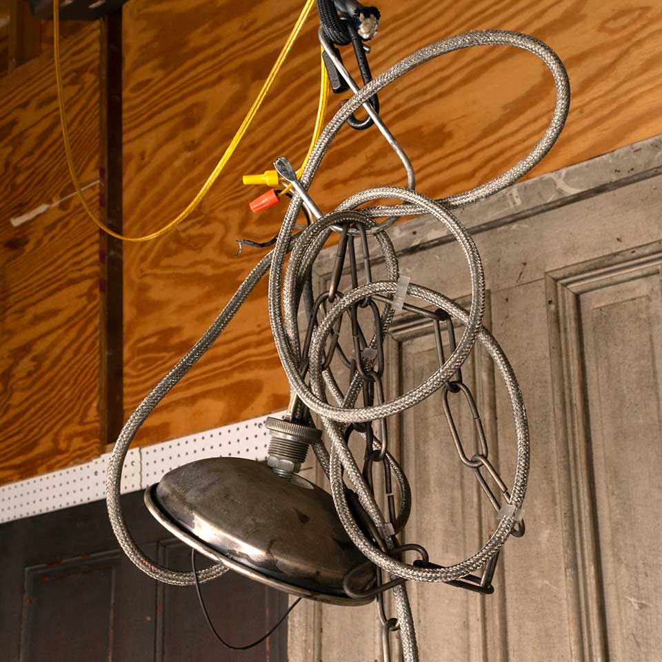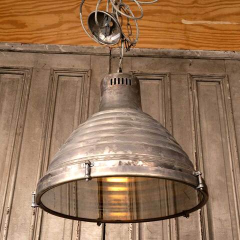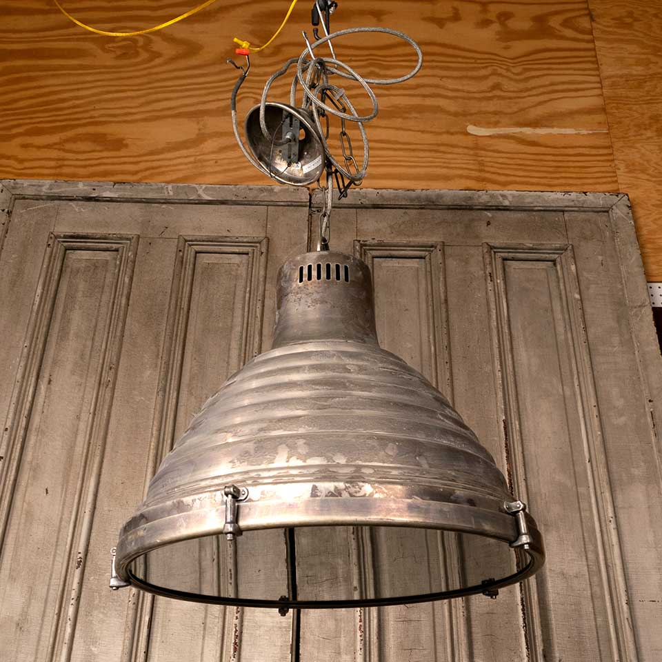 Architectural salvage metal industrial style chandelier light fixture with glass cover measuring approx. 20 1/4" diameter x 19" tall with a 36" long chain. See photos to evaluate condition. Salvaged lighting should be inspected by a licensed electrician prior to installation.