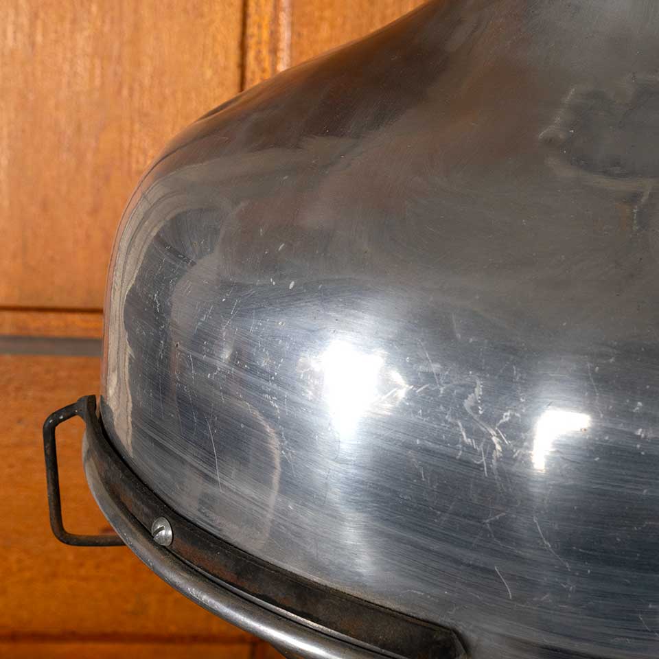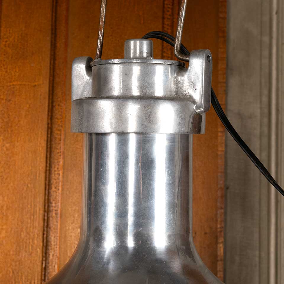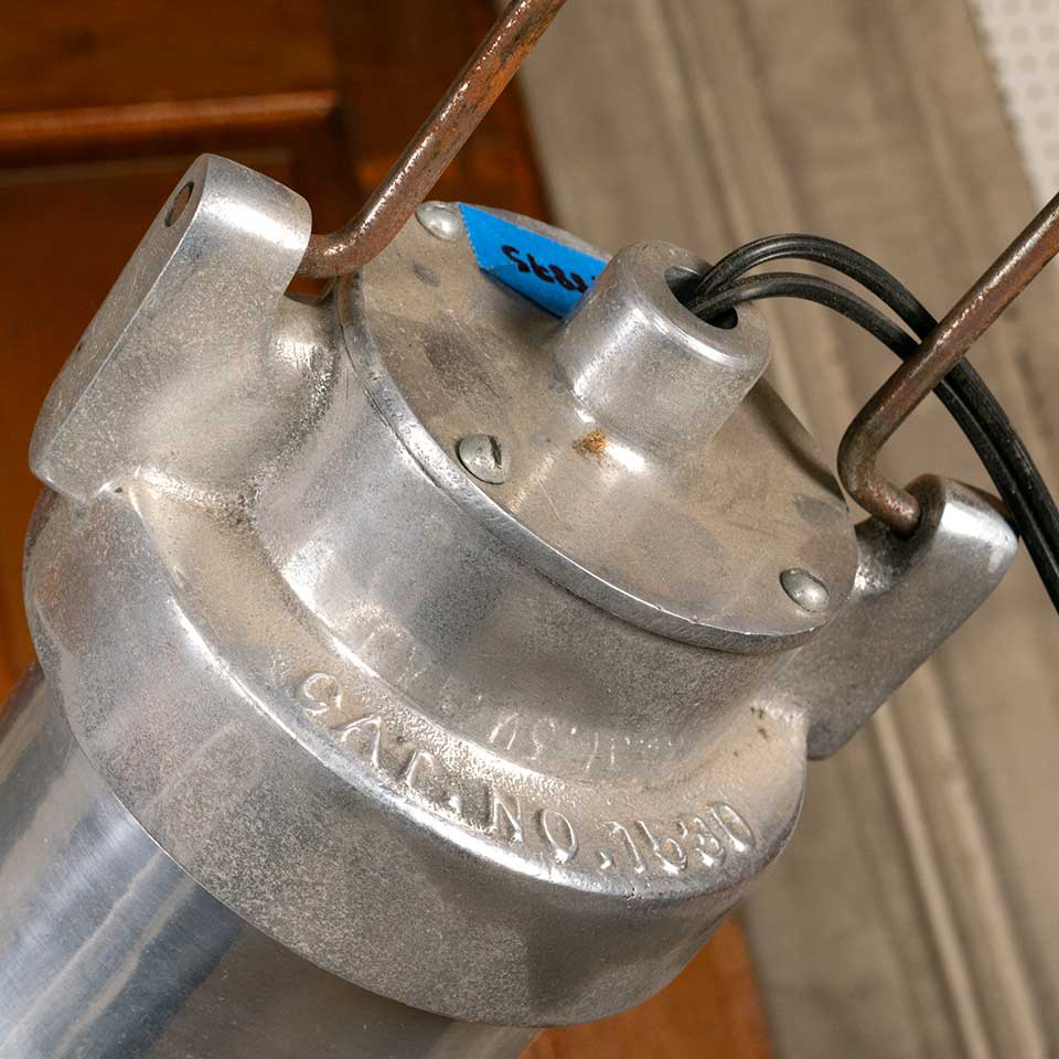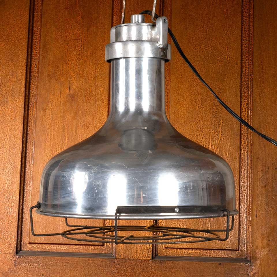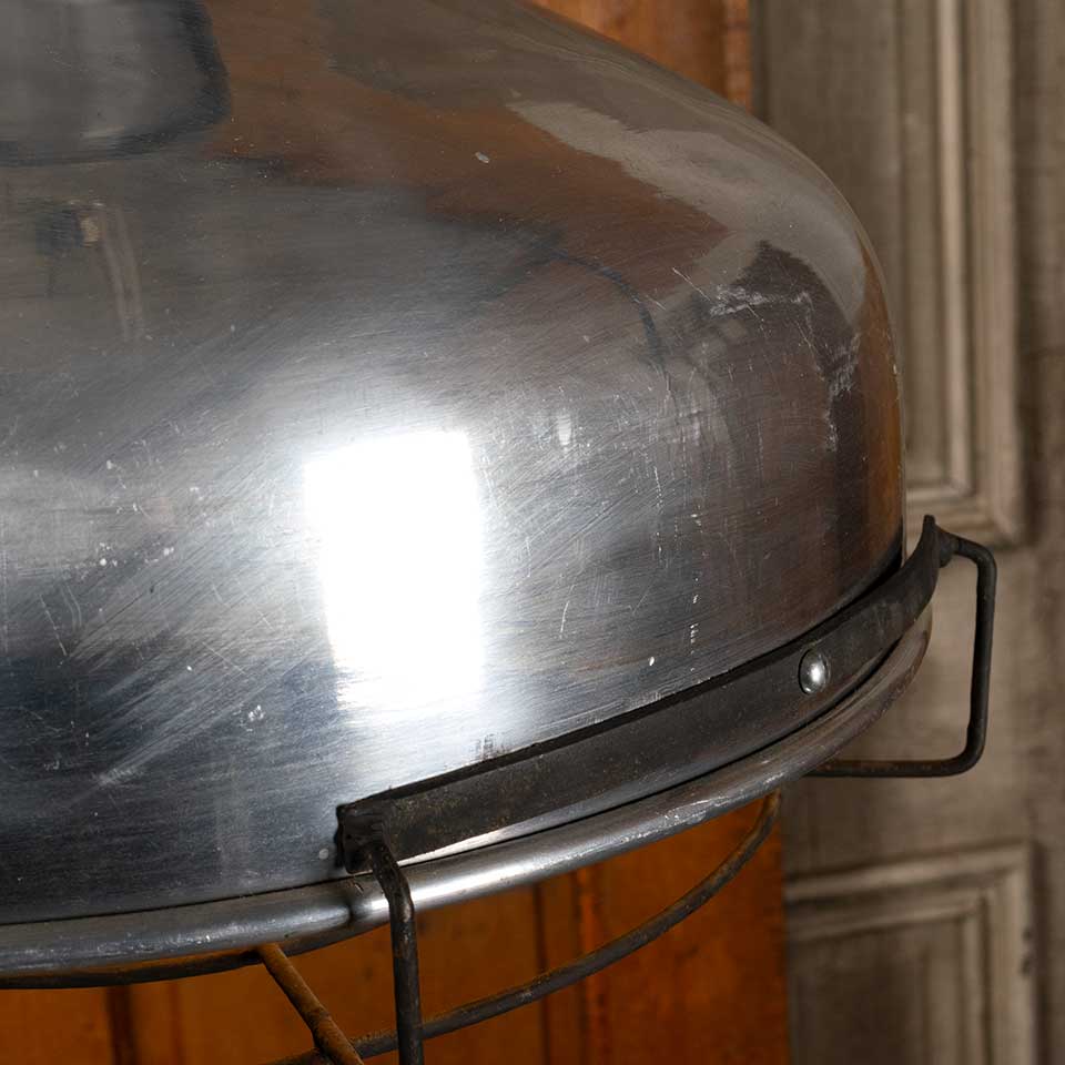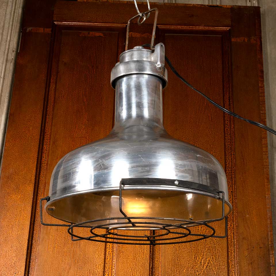 Architectural salvage industrial polished aluminum pendant light fixture with protective under cage measuring approx. 16" in diameter x 20 1/4" tall with a 102" long cord. See photos to evaluate condition. Salvaged lighting should be inspected by a licensed electrician prior to installation.