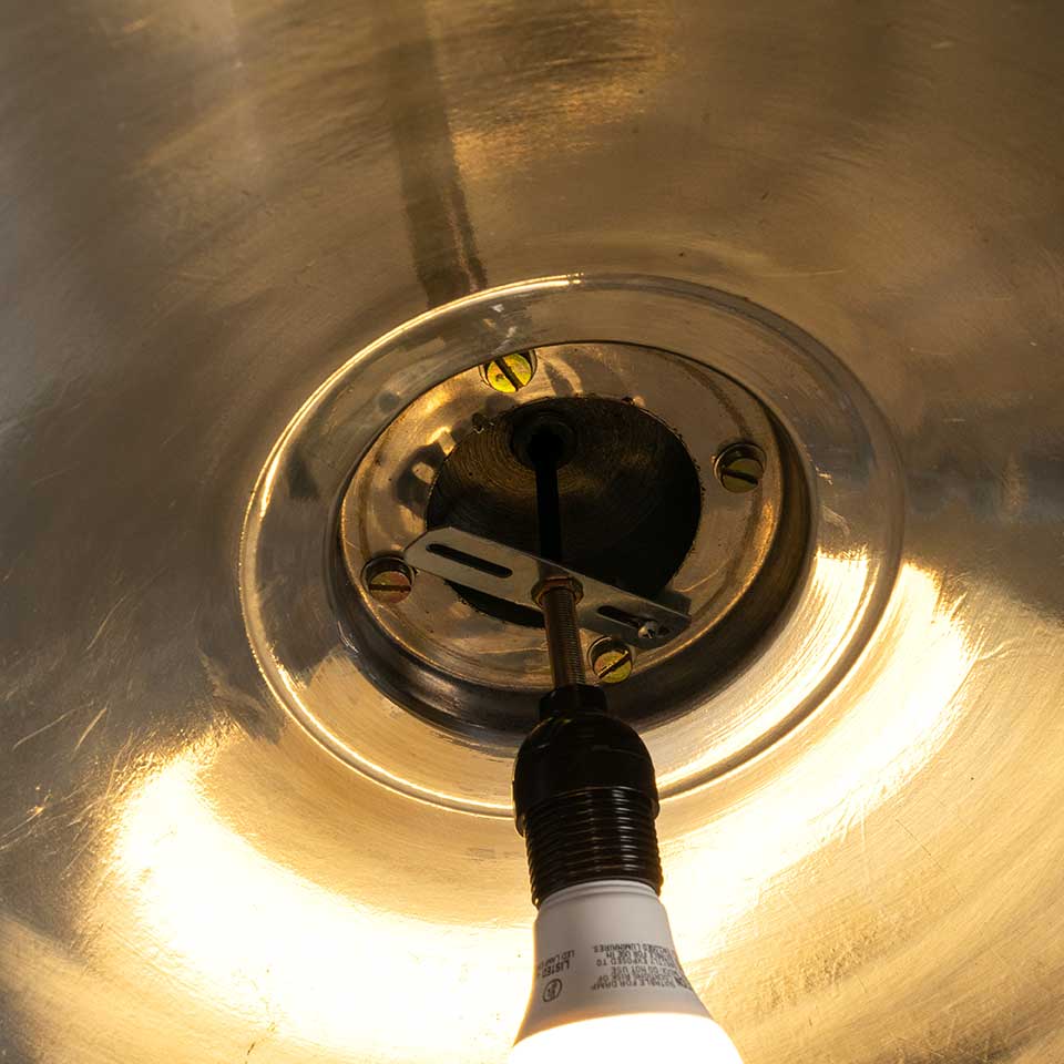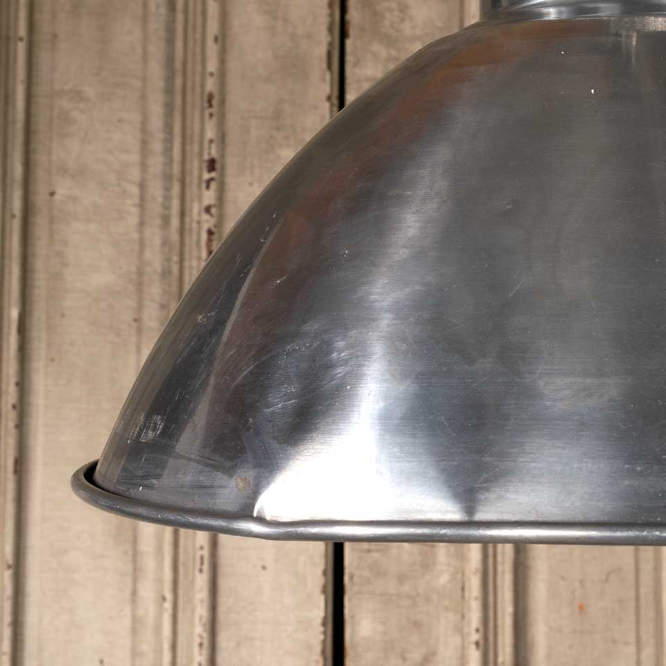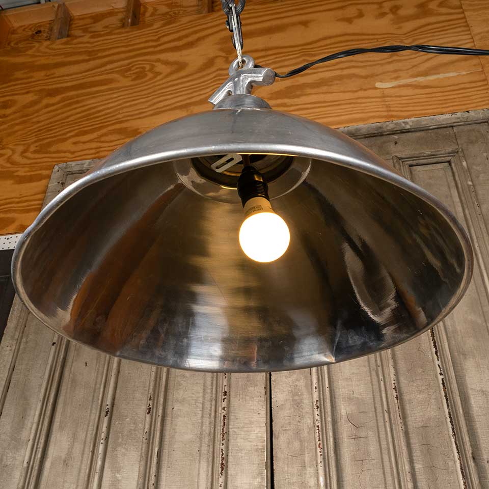 Architectural salvage industrial polished aluminum pendant light fixture with protective under cage measuring approx. 20" in diameter x 16 1/2" tall with a 115" long cord. Condition is not pristine, see photos to evaluate. Salvaged lighting should be inspected by a licensed electrician prior to installation.