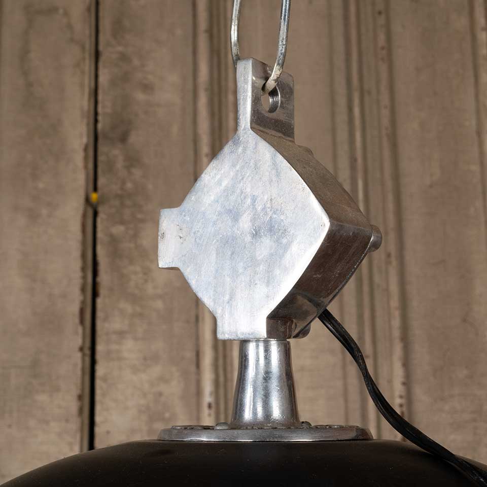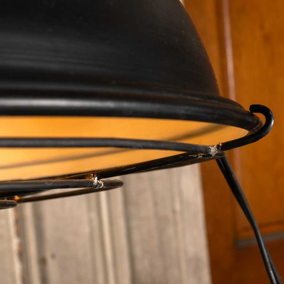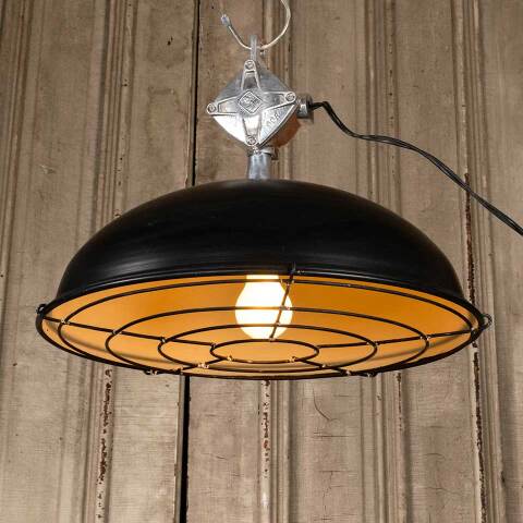Modern black industrial pendant light fixture with protective bulb cage measuring approx. 18 3/4" in diameter x 15" tall with a 128" long cord. See photos to evaluate condition. Salvaged lighting should be inspected by a licensed electrician prior to installation.