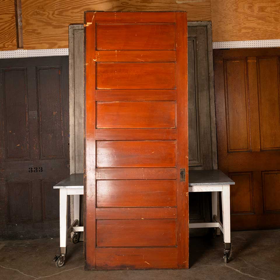 Architectural salvage antique pine six panel pocket door with Victorian Eastlake hardware and bottom wheels measuring approx. 41 1/8" wide x 101 3/4" tall x 1 3/4" thick. See photos to evaluate condition.