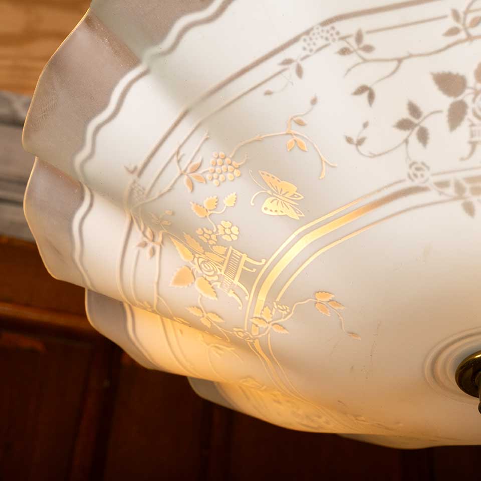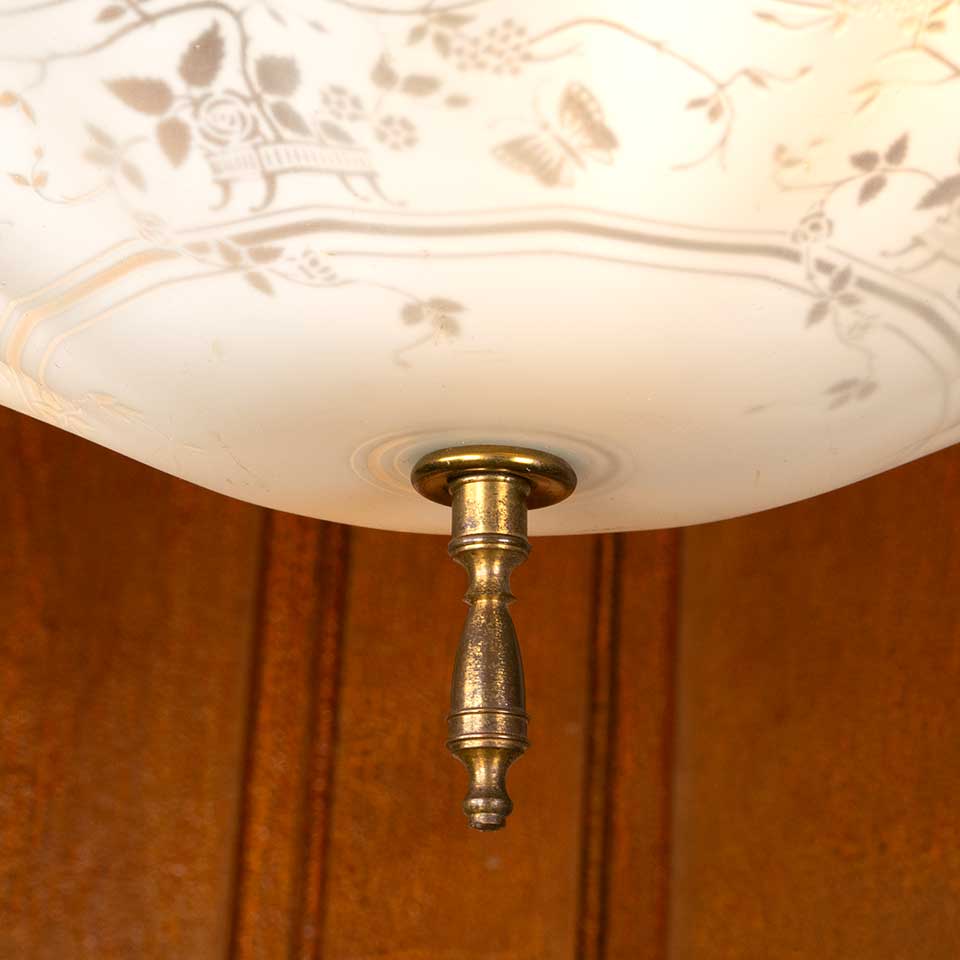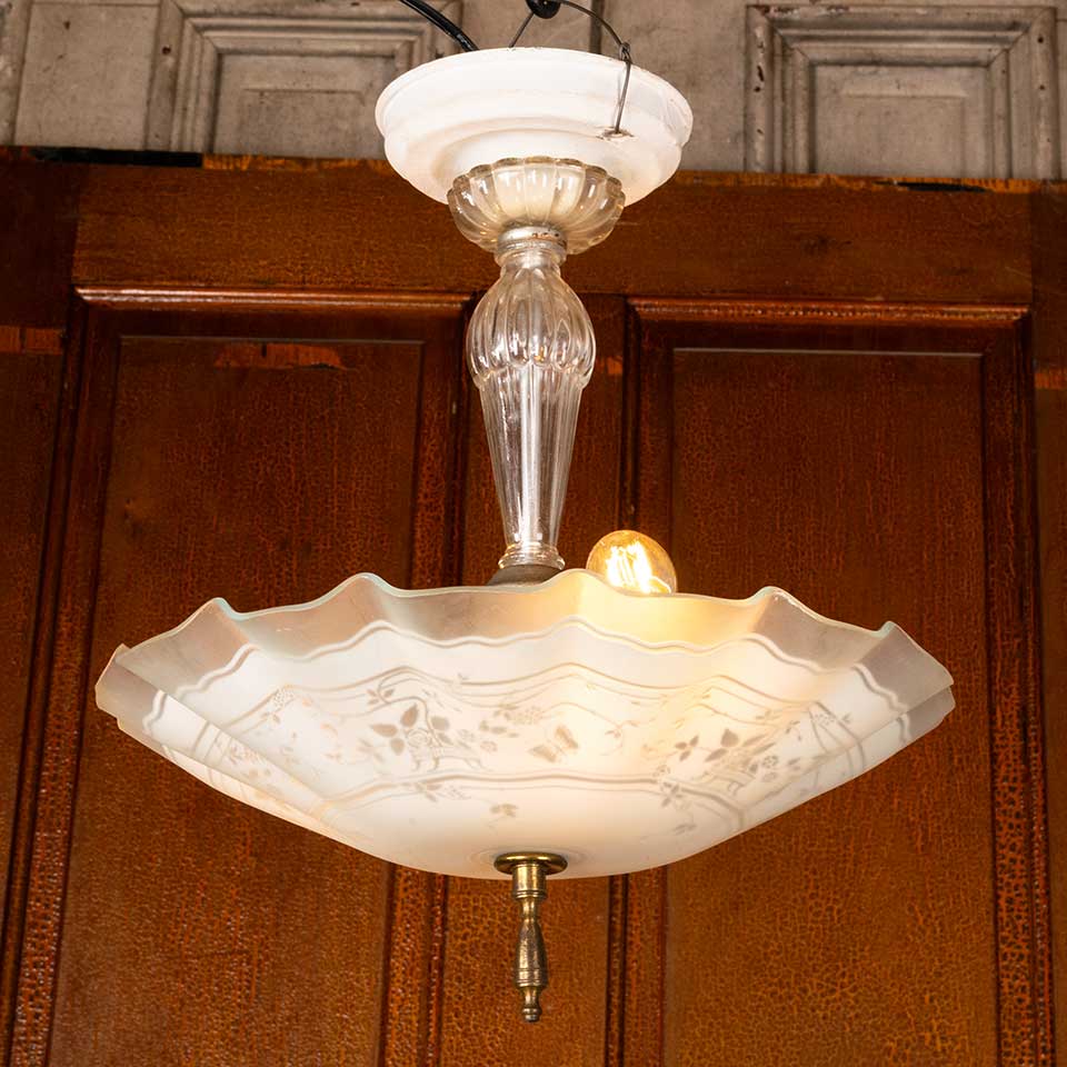 Architectural salvage antique two bulb pressed glass chandelier light fixture measuring approx. 13" in diameter x 15" tall. See photos to evaluate condition. Salvaged lighting should be inspected by a licensed electrician prior to installation.