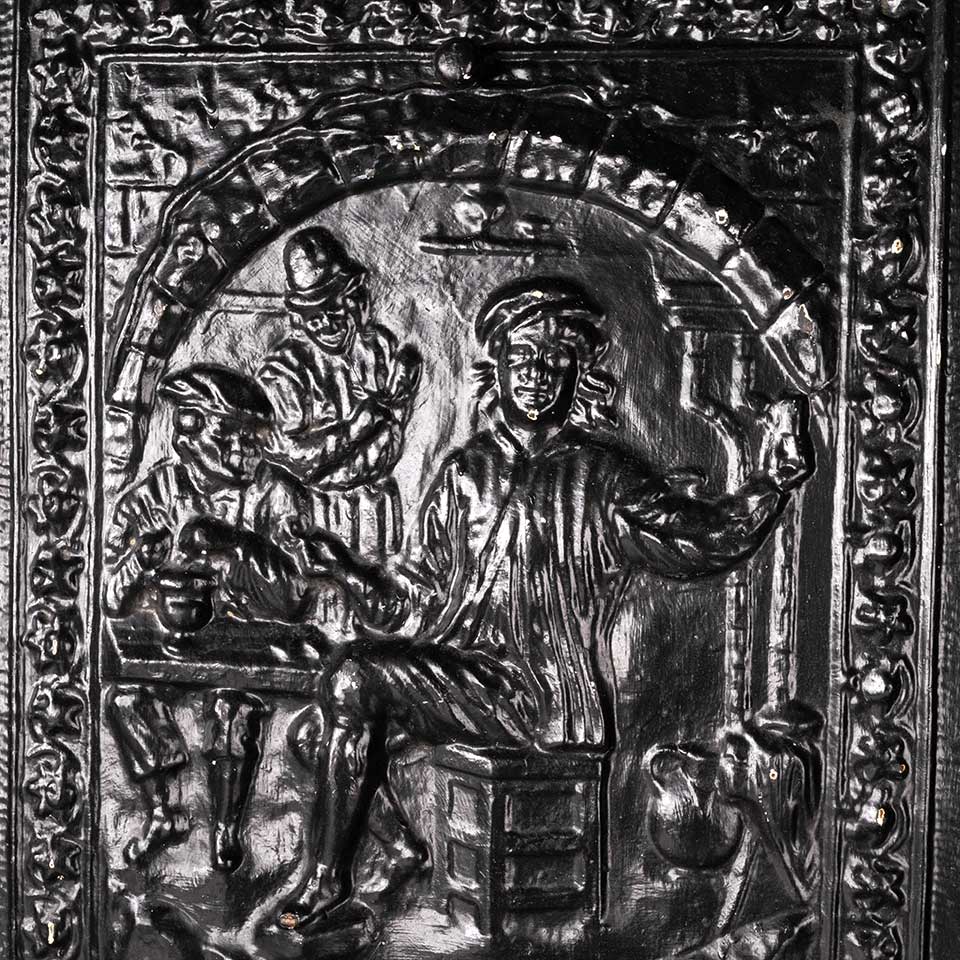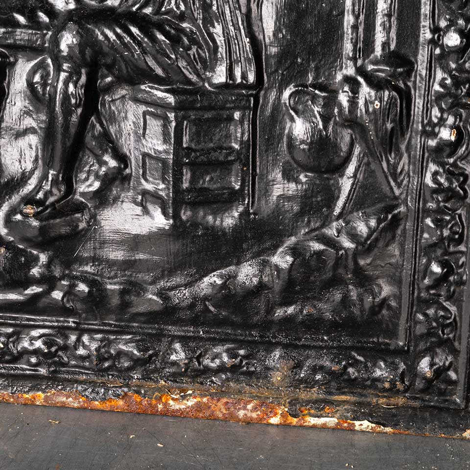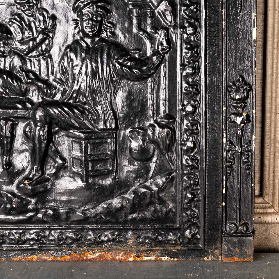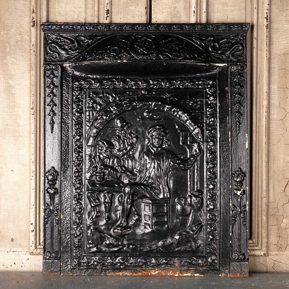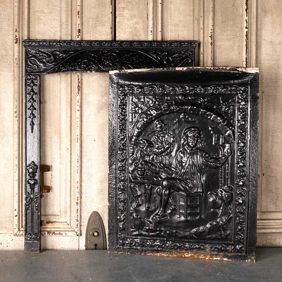 Architectural salvage antique cast iron fireplace surround and stamped / pressed metal summer front cover with figural motif. The surround measures approx. 25 1/4" wide x 30 1/2" tall x 3 1/2" front to back and the summer front cover measures approx. 20 1/8" wide x 26 1/8" tall x 1 5/8" front to back. See photos to evaluate condition. Priced at $475 for the 2 piece set.