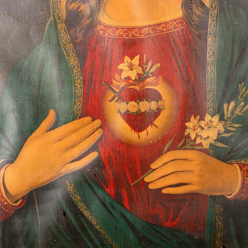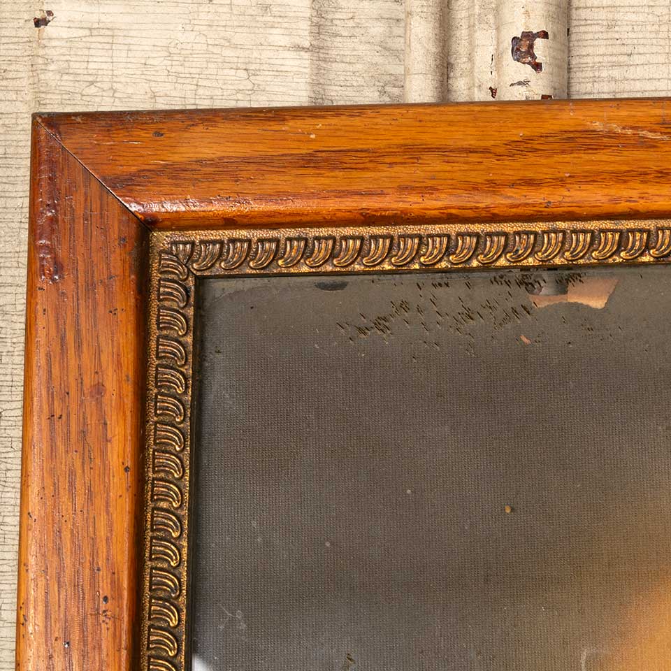 Antique Immaculate Sacred Heart of Mary colored print in oak frame measuring approx. 21 5/8" wide x 27 3/4" tall x 3/4" front to back. See photos to evaluate condition.