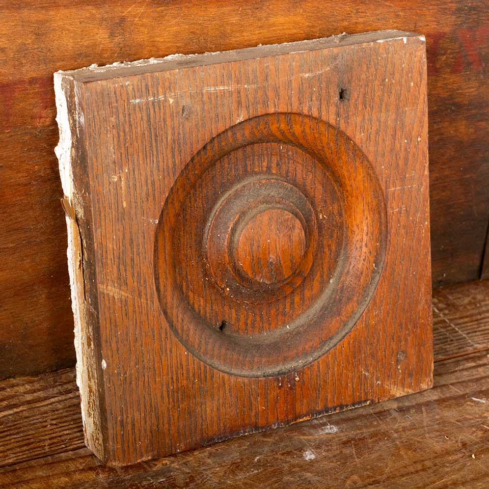Architectural salvage antique interior window or door oak rosette trim block measuring approx. 6" square x 1 1/8" front to back. Color and condition may vary, see photos to evaluate. Priced at $15/each.