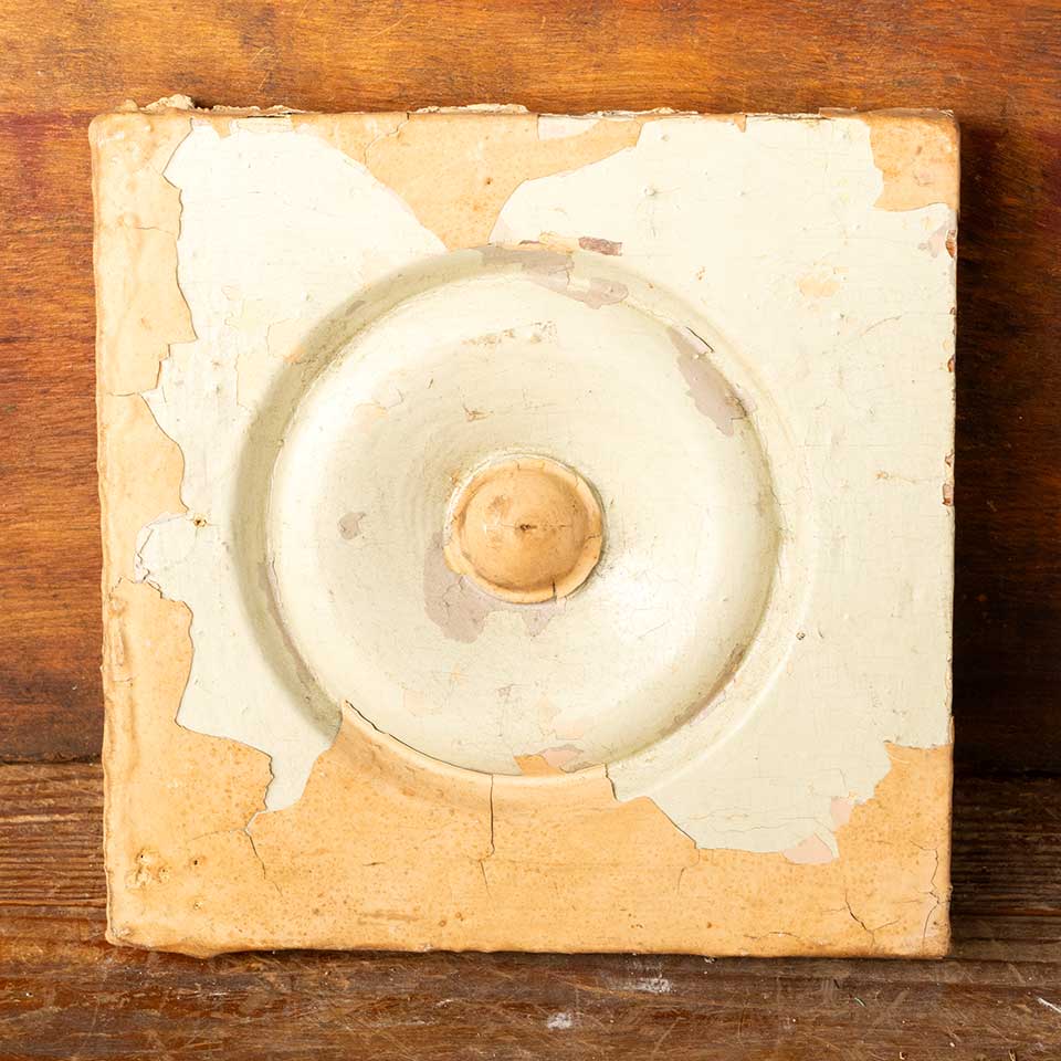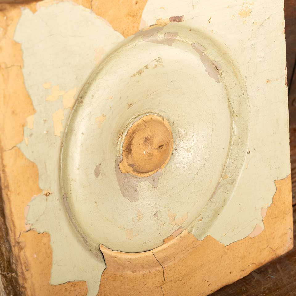 Architectural salvage antique interior window or door painted wood rosette trim block measuring approx. 6" square x 1 1/8" front to back. Color and condition may vary, see photos to evaluate. Priced at $10/each.