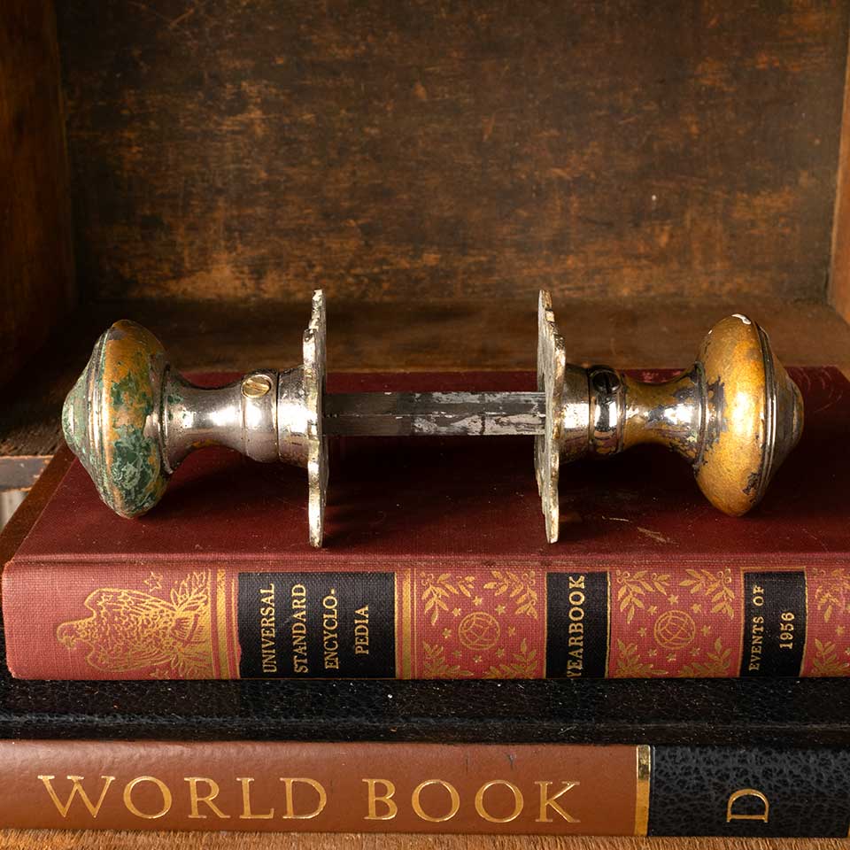 Architectural salvage antique Tudor brass 1 3/4" diameter doorknobs door hardware set with worn nickel plating including a pair of backplates (2 5/8" x 1 7/8") and a threaded spindle with set screws. Color and condition may vary, see photos to evaluate. Priced at $195/set.
