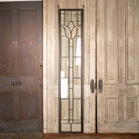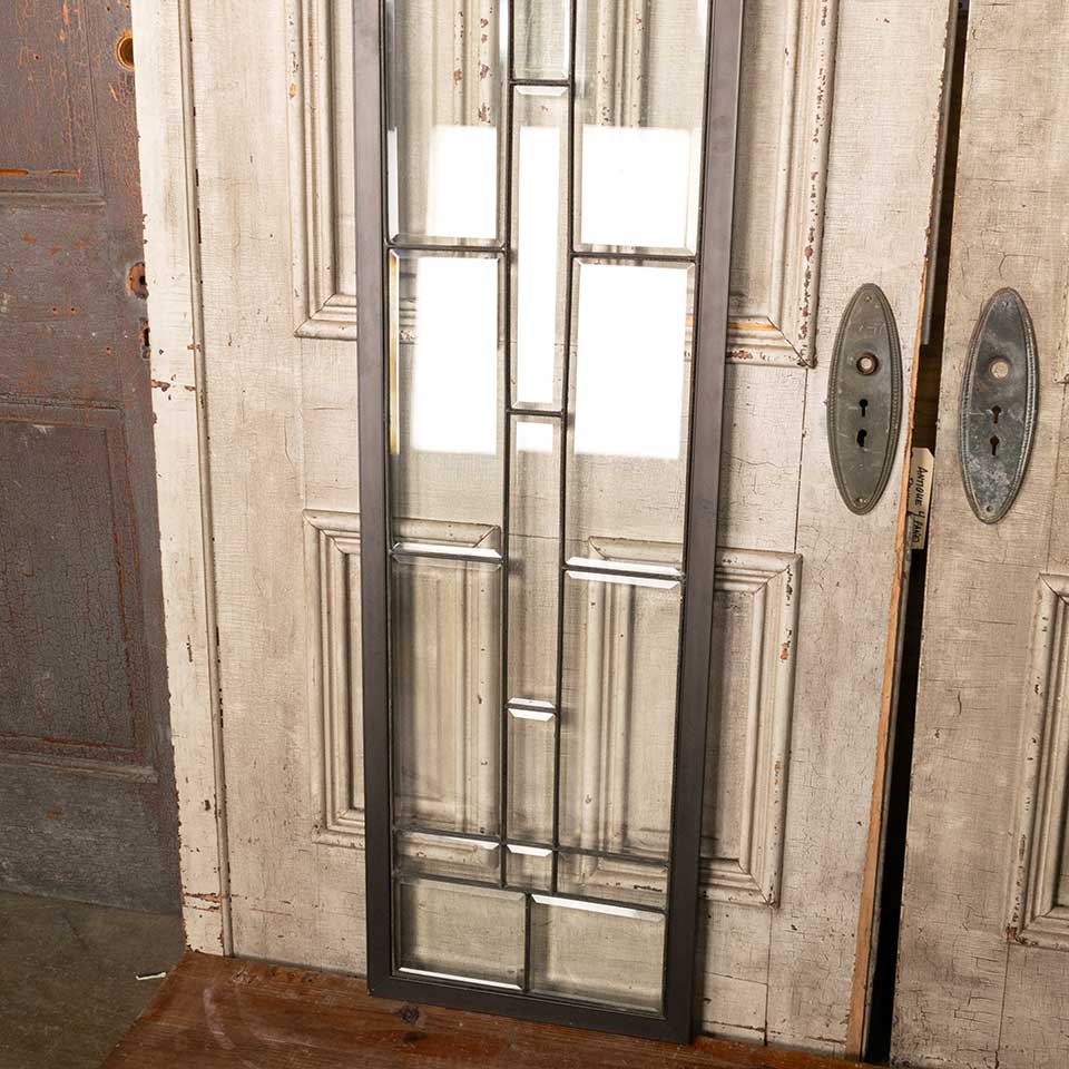 Architectural salvage antique leaded beveled glass side lite window panel with metal frame measuring approx. 17" wide x 86 5/8" tall x 1/2" front to back. One pane is chipped. See photos to evaluate condition.