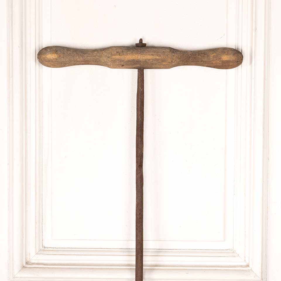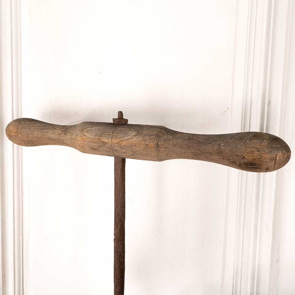 Antique iron barn beam hand auger peg hole drilling tool with wood T- handle measuring approx. 55 1/2" tall (overall) with a 16 1/2" x 1 3/4" handle. See photos to evaluate condition.