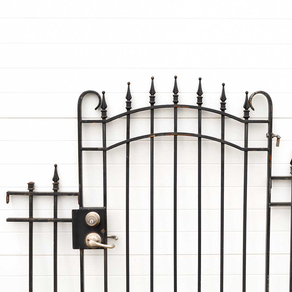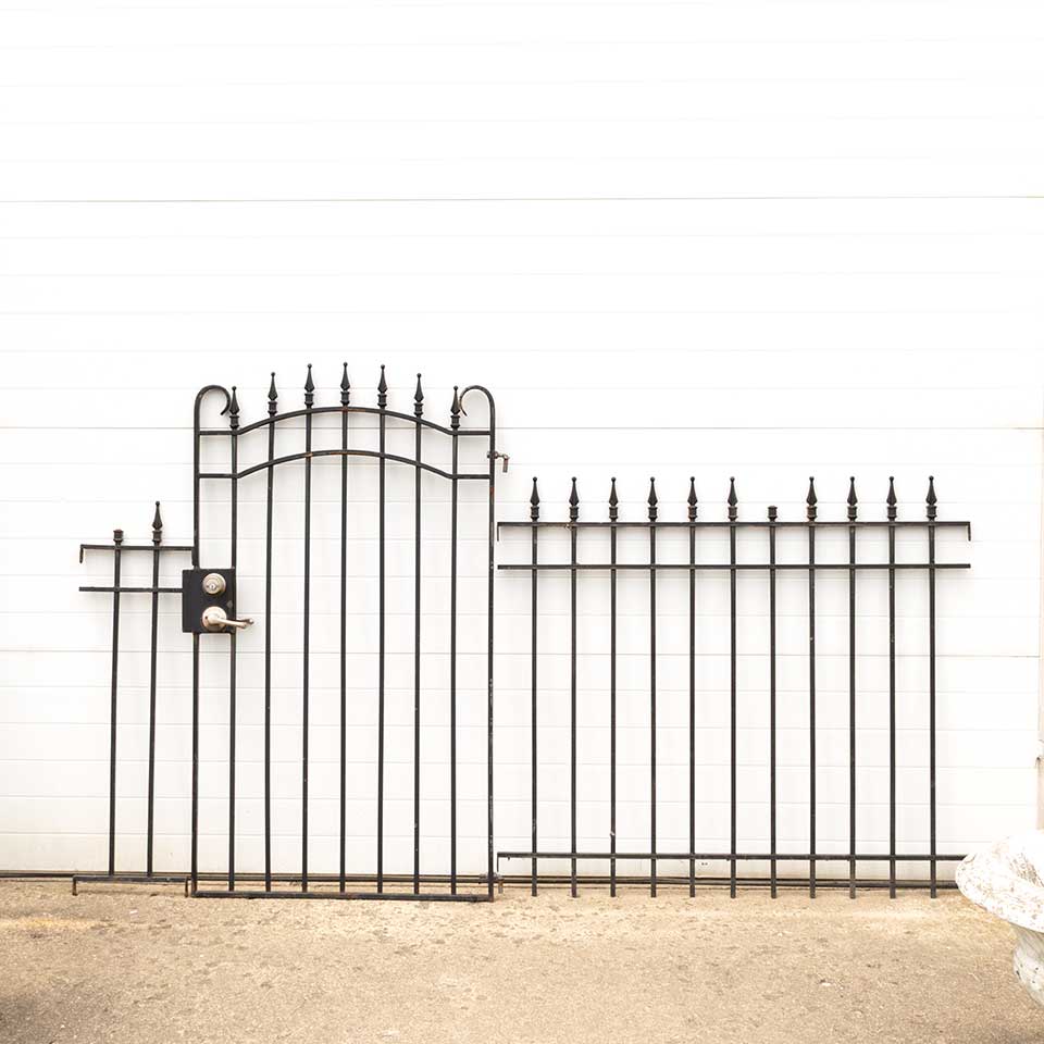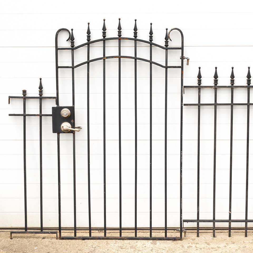 Architectural salvage wrought iron garden gate (31 3/4" wide x 56 1/4" tall x 1" front to back ) and fencing measuring approx. 44" tall with as follows: 2 @ 12" (x 42" tall), 3 @ 49 3/8", 4 @ 51 1/2", 5 @ 71 5/8", and 3 @ 80 1/2". There are a few finials missing and there are no fence posts included. See photos to evaluate condition. Priced at $3,950 for all the fencing and matching gate.