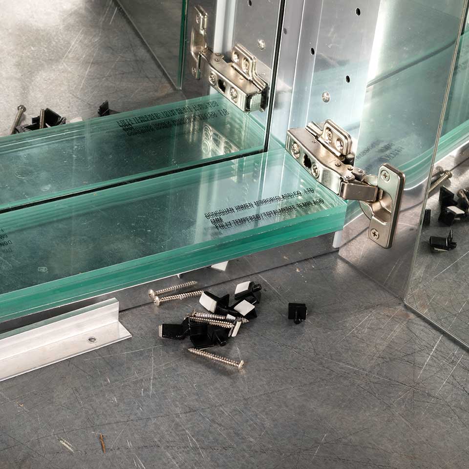Architectural salvage painted wood framed beveled glass mirror medicine cabinet with mirrored back and three adjustable glass shelves measuring approx. 15" wide x 26 1/4" tall x 5 1/4" front to back. See photos to evaluate condition.