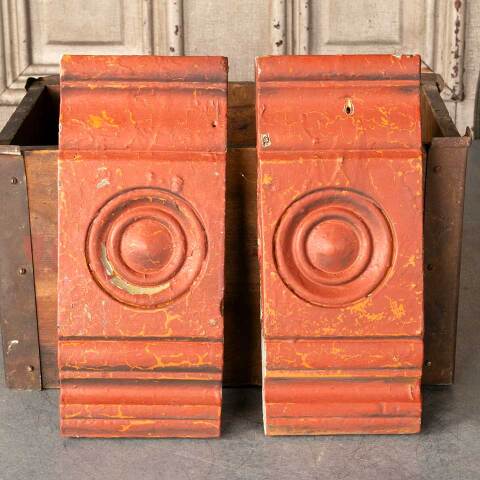 Pair of architectural salvage antique painted wood interior door / window rosette trim blocks each measuring approx. 4 5/8" wide x 11" tall x 1 3/16" front to back. See photos to evaluate condition. Priced at $50 for the pair.