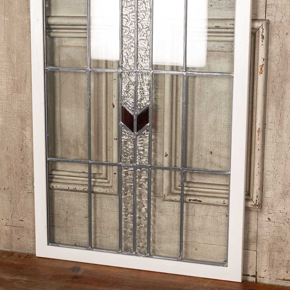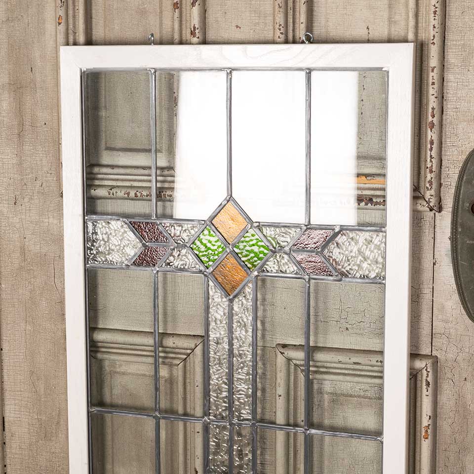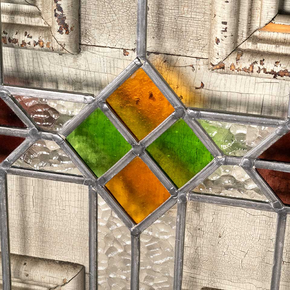 Architectural salvage antique stained and leaded glass window measuring approx. 21 3/4" wide x 42 1/2" tall x 3/4" thick. See photos to evaluate condition.