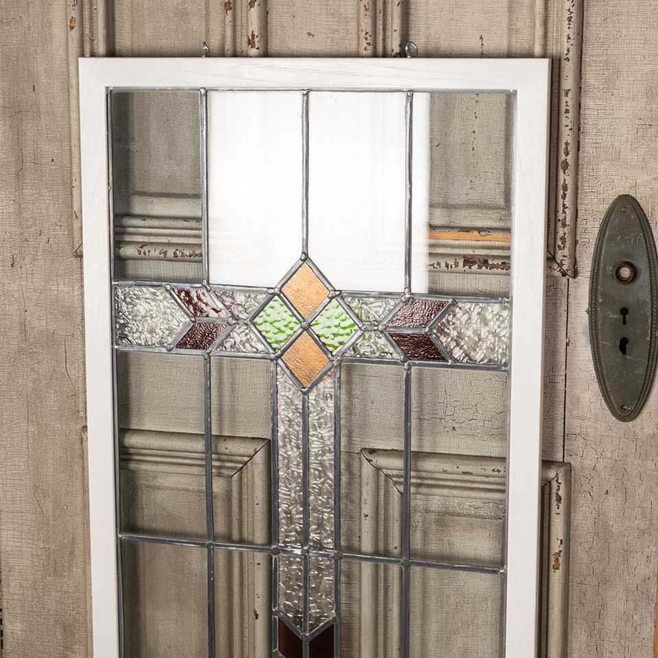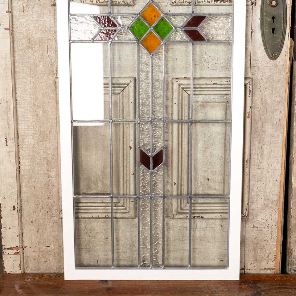 Architectural salvage antique stained and leaded glass window measuring approx. 21 3/4" wide x 42 1/2" tall x 3/4" thick. See photos to evaluate condition.