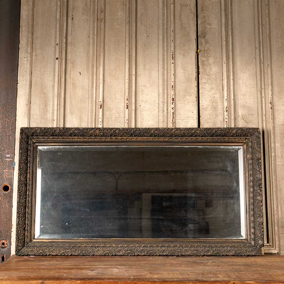 Architectural salvage antique beveled glass mirror in ornate wood frame measuring approx. 46" wide x 24 1/4" tall x 2 1/4" front to back. See photos to evaluate condition.