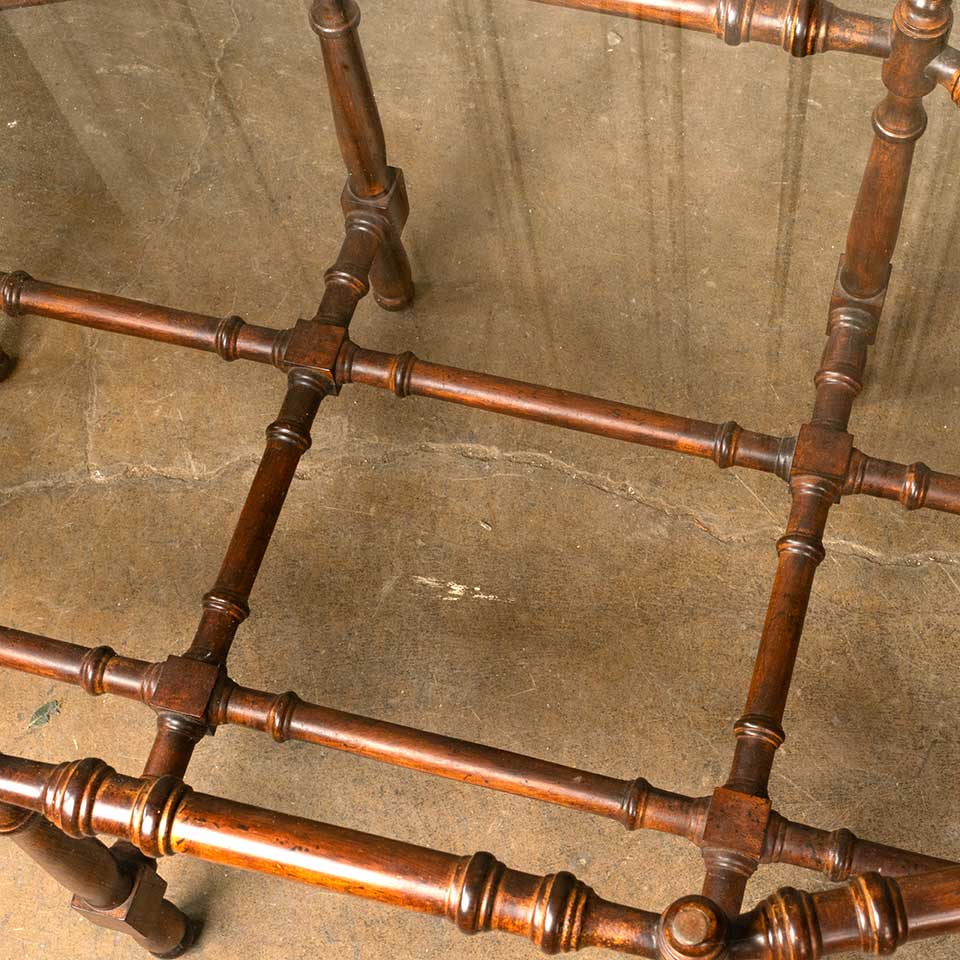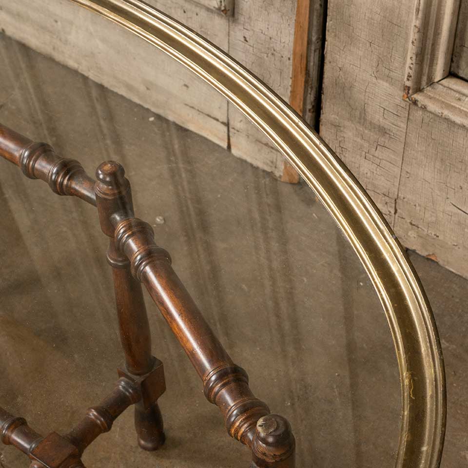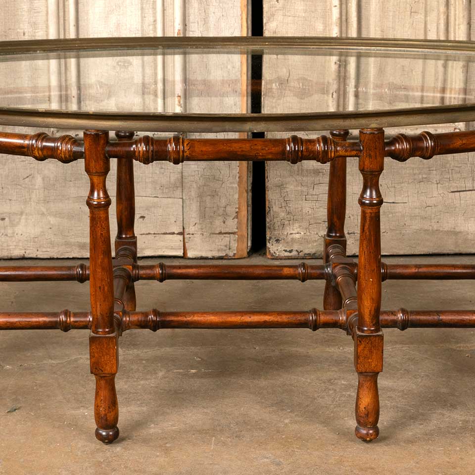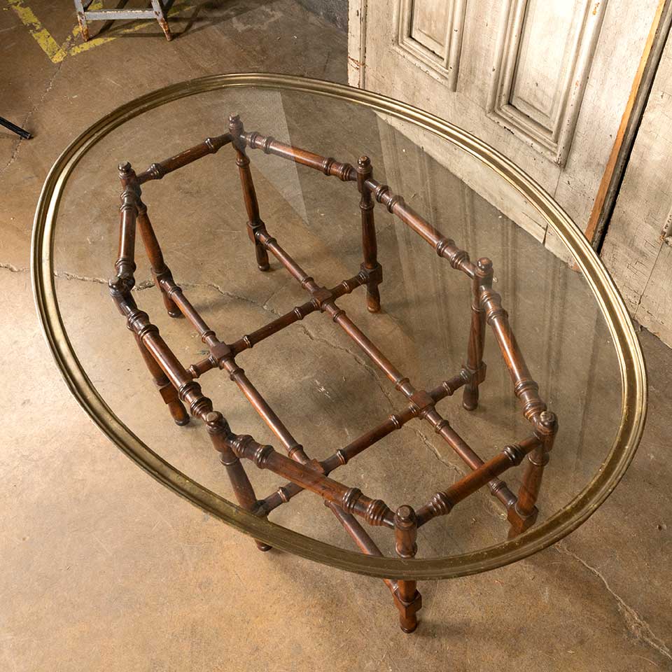 Vintage Hollywood Regency coffee table with wood base and oval glass top measuring approx. 44 3/4" wide x 17 1/4" tall x 31 1/4" front to back. See photos to evaluate condition.
