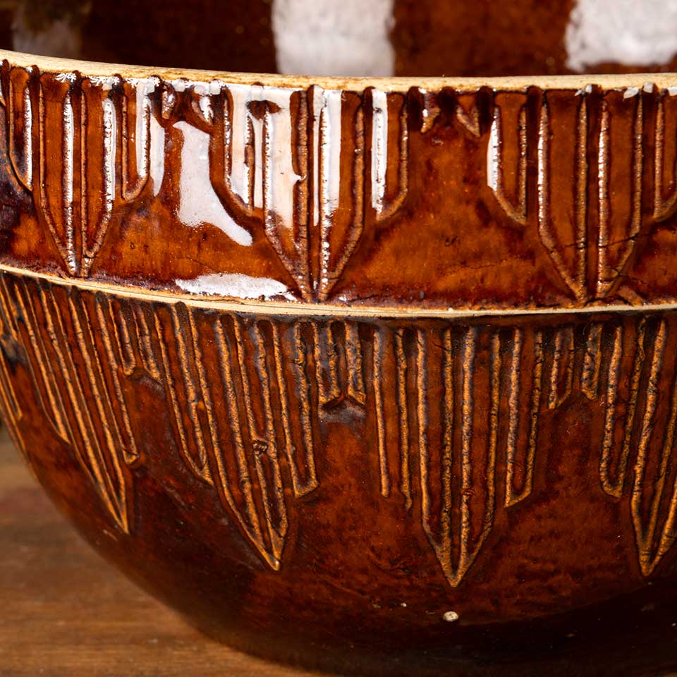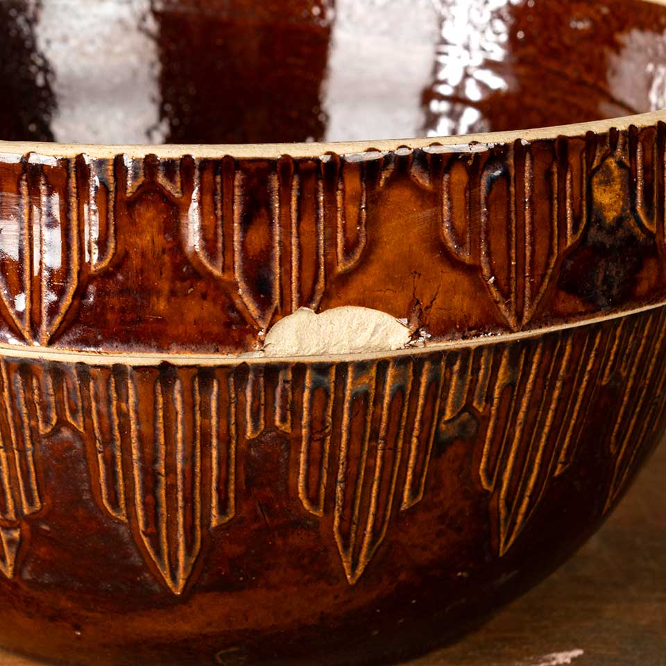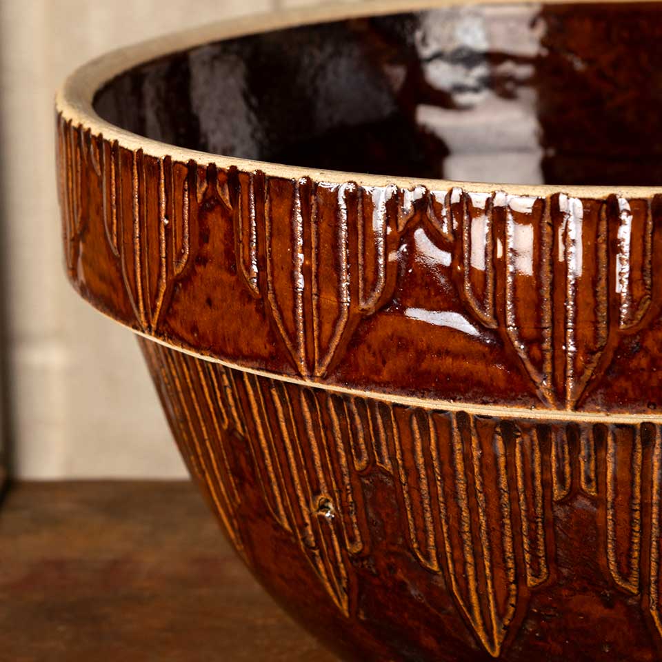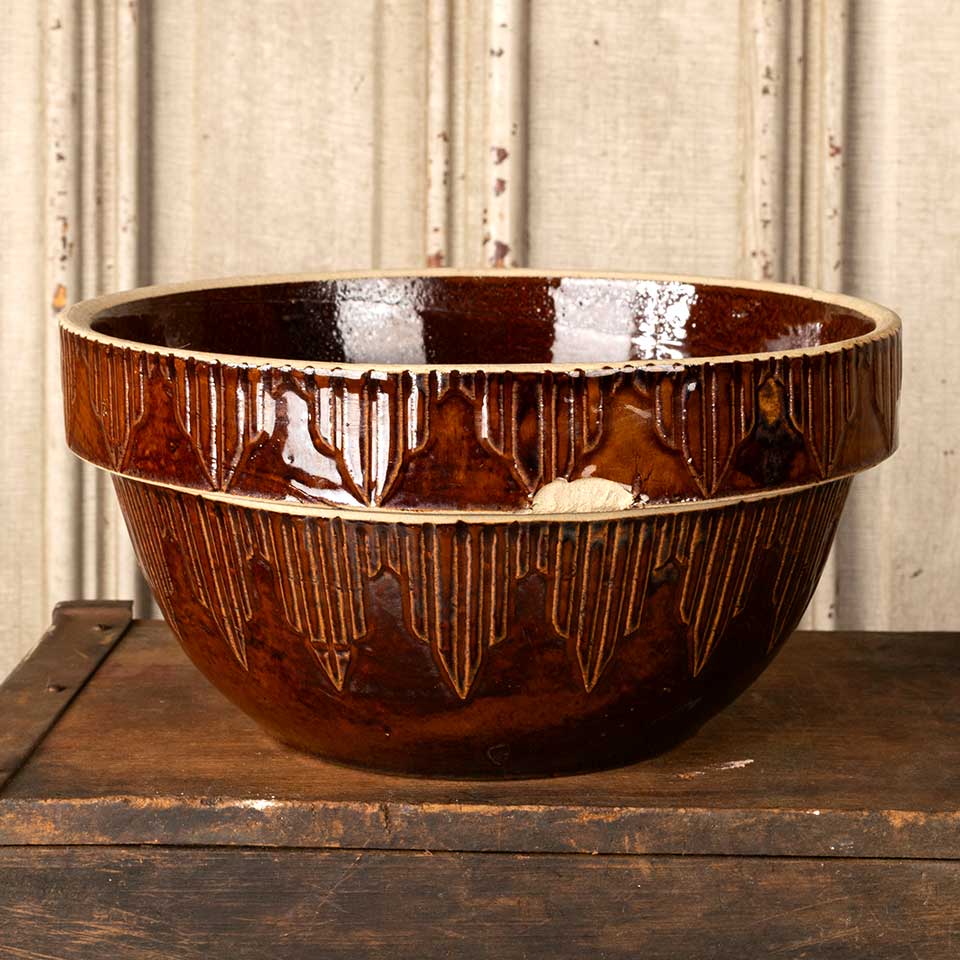 Antique salt glazed stoneware dough bowl measuring approx. 10" in diameter x 5" tall. There is a chip on the rim, see photos to evaluate condition.