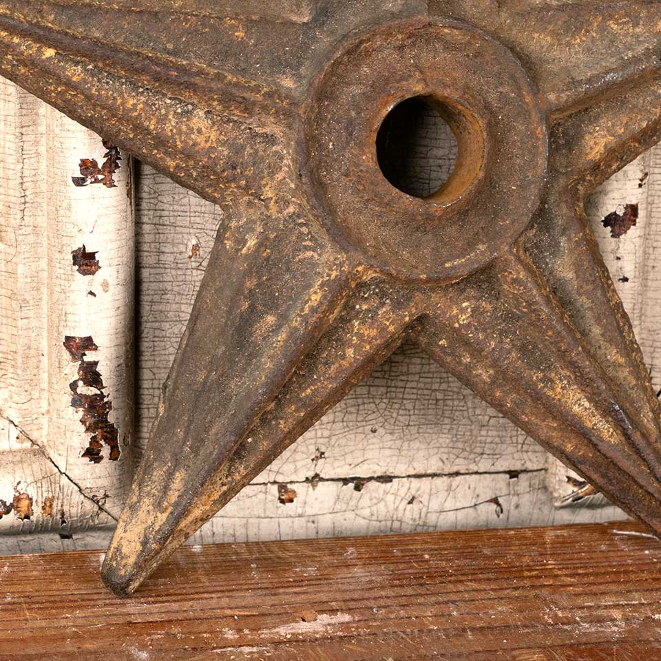 Architectural salvage antique cast iron exterior building anchor star measuring approx. 9 3/4" in diameter x 1" front to back. See photos to evaluate condition.