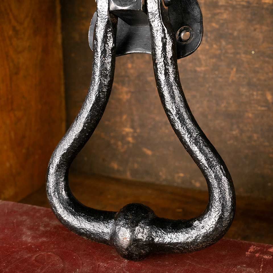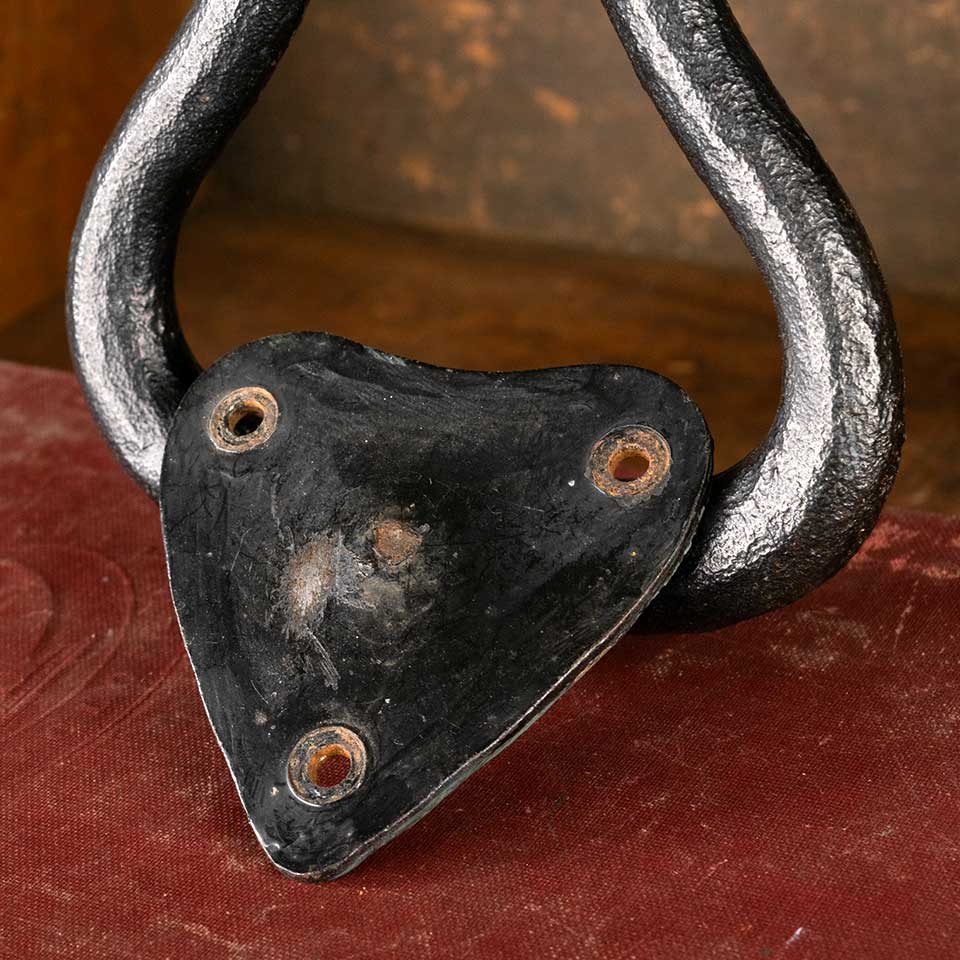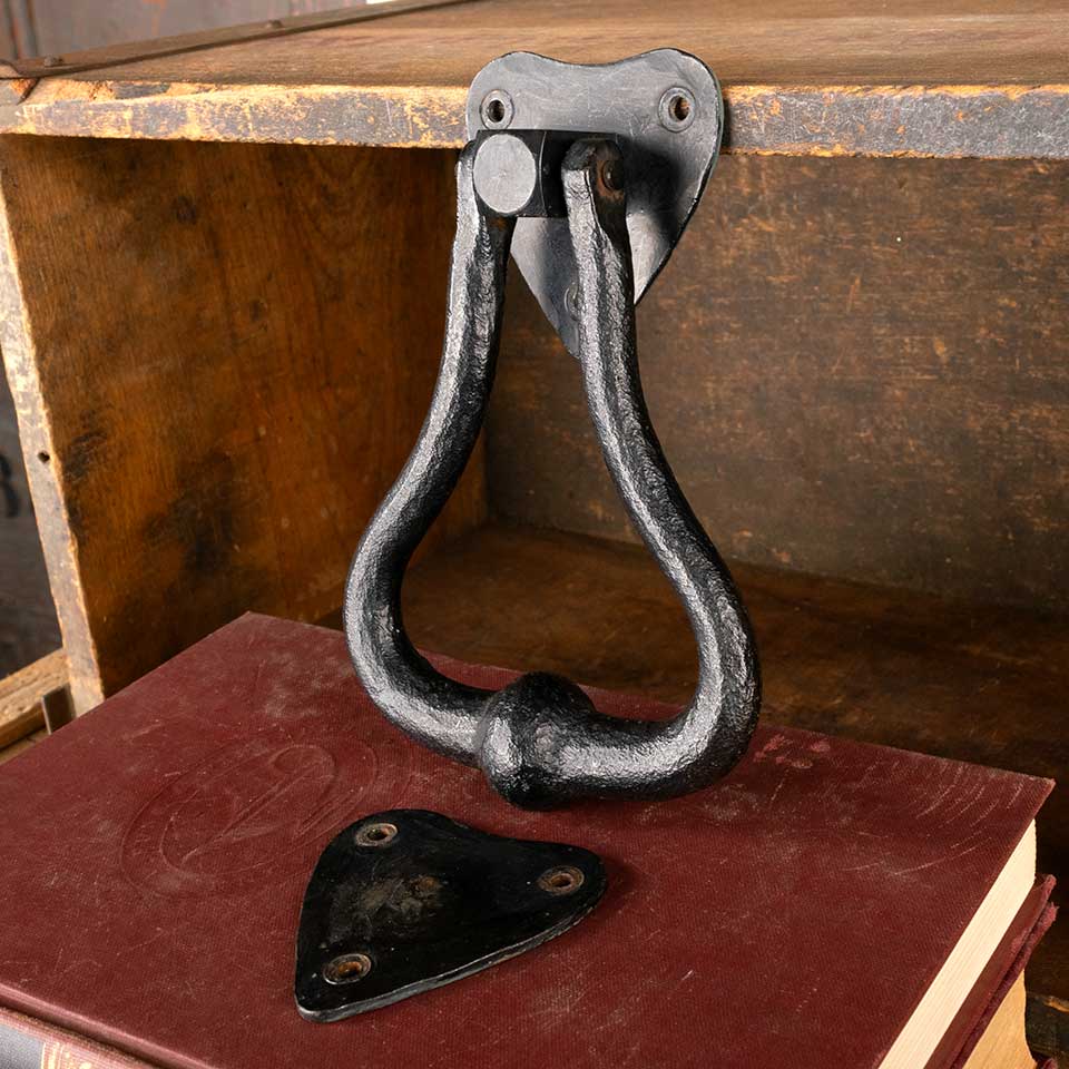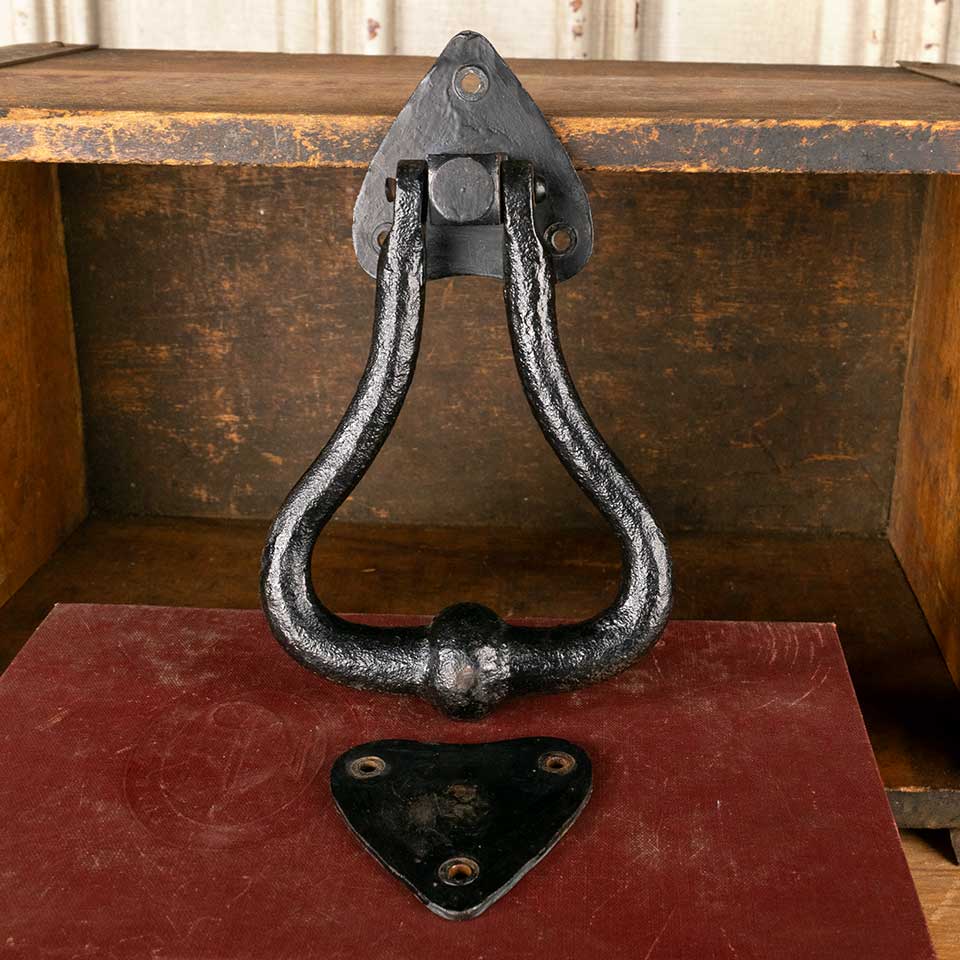 Architectural salvage vintage wrought iron door knocker hardware with plate measuring approx. 4" wide x 7 1/8" tall x 1 1/4" front to back. See photos to evaluate condition.