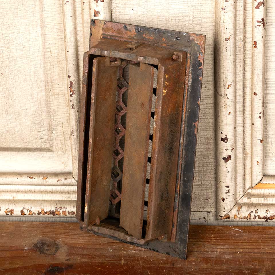 Architectural salvage antique cast iron heat grate floor vent cover measuring approx. 3 7/8" x 7 7/8" (insert dimensions) and 5 5/16" x 9 1/4" (overall dimensions). The louver operator is missing a piece that actuates the louvers. See photos to evaluate condition.