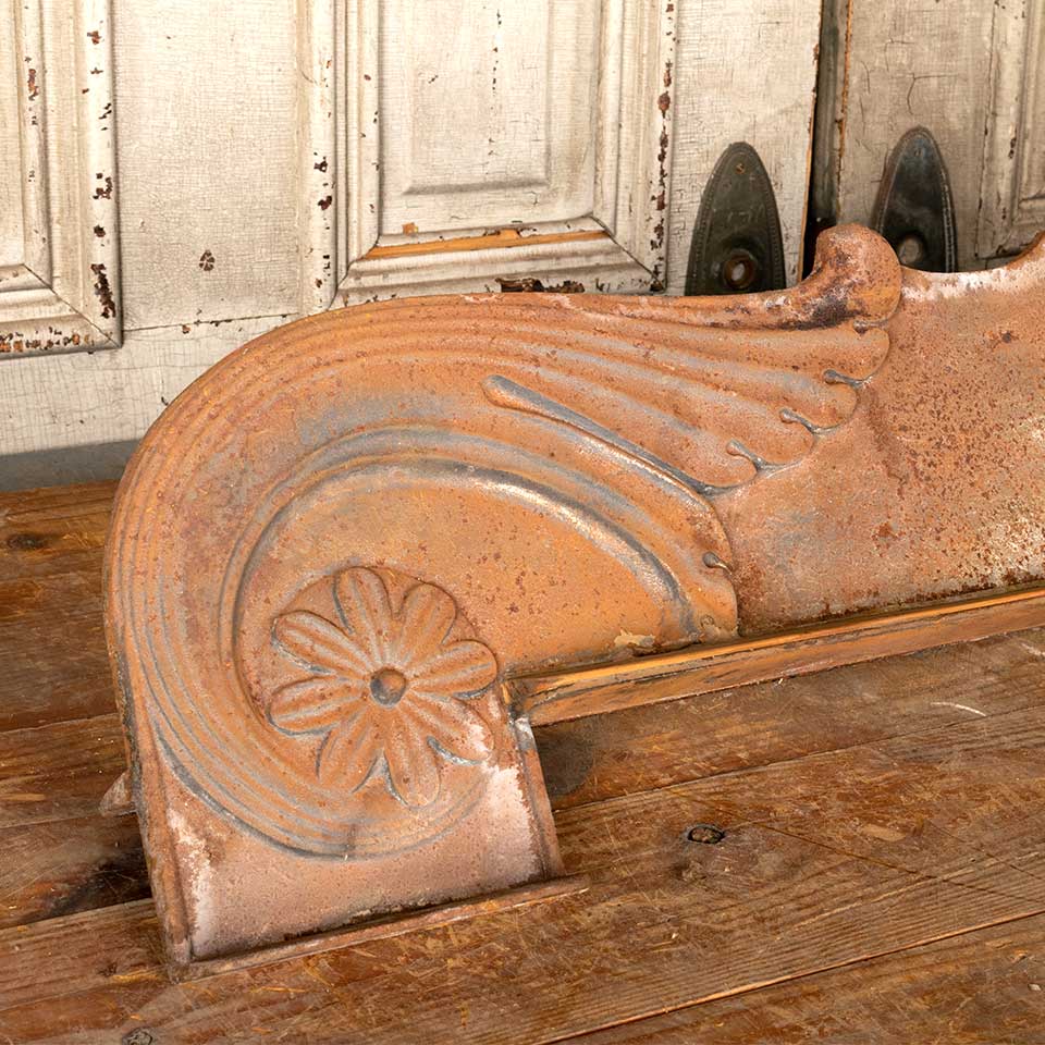 Architectural salvage antique cast iron pediment measuring approx. 51 1/4" wide x 11 1/4" tall x 5" front to back. See photos to evaluate condition.