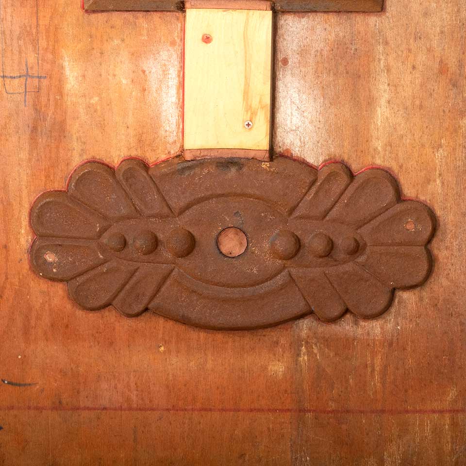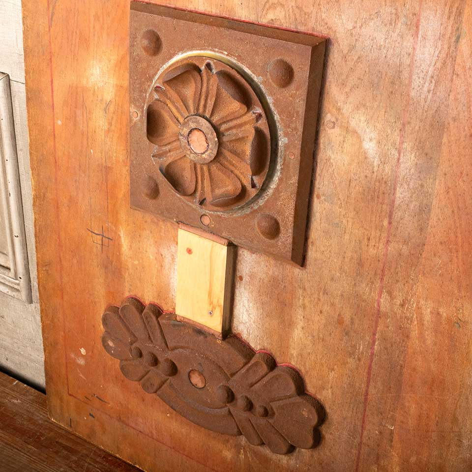 Architectural salvage antique cast iron building wall anchor plates foundry mold mounted to plywood measuring approx. 31 1/2" wide x 38" tall x 3" front to back. See photos to evaluate condition.