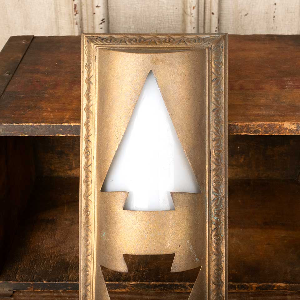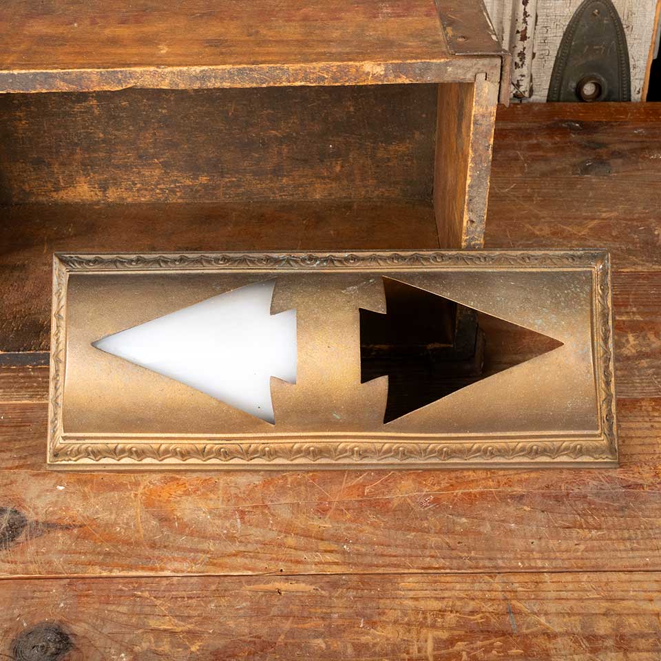 Architectural salvage antique cast bronze elevator UP / DOWN indicator arrow light cover measuring approx. 5" wide x 12 1/2" tall x 3" front to back. There's a piece of curved plexiglass in one of the openings, but it's probably not original to the cover. See photos to evaluate condition.