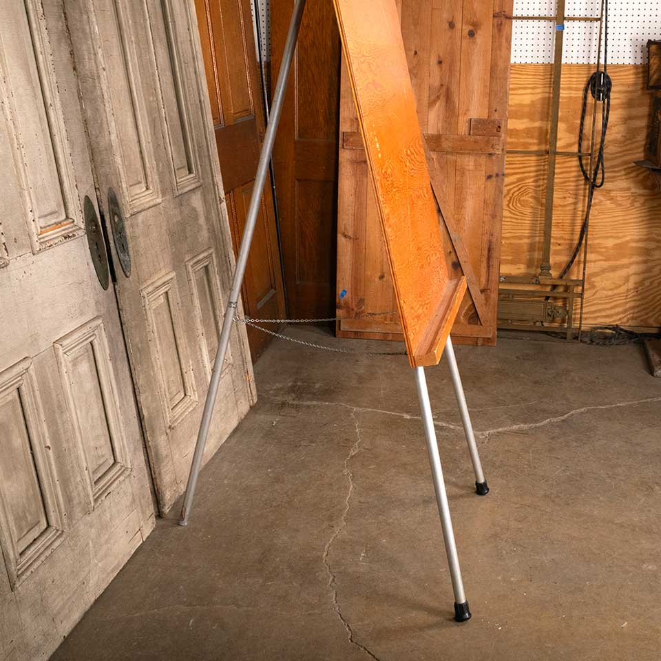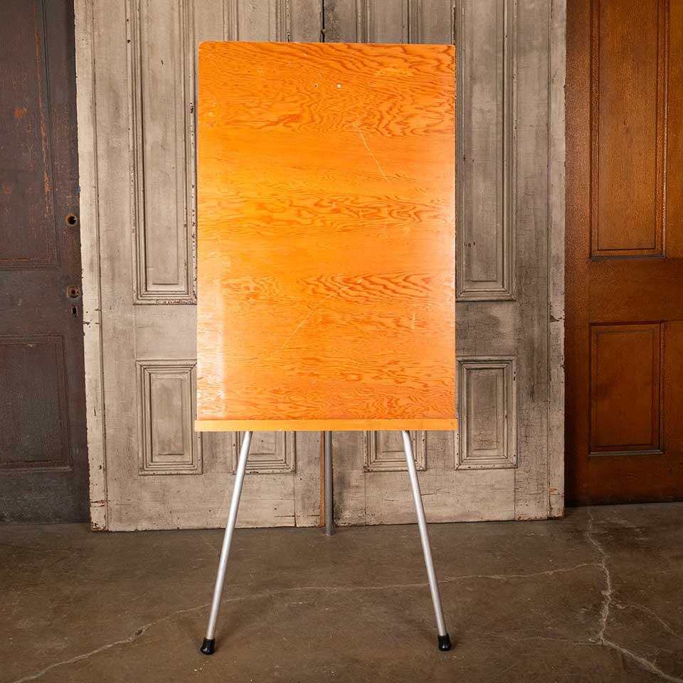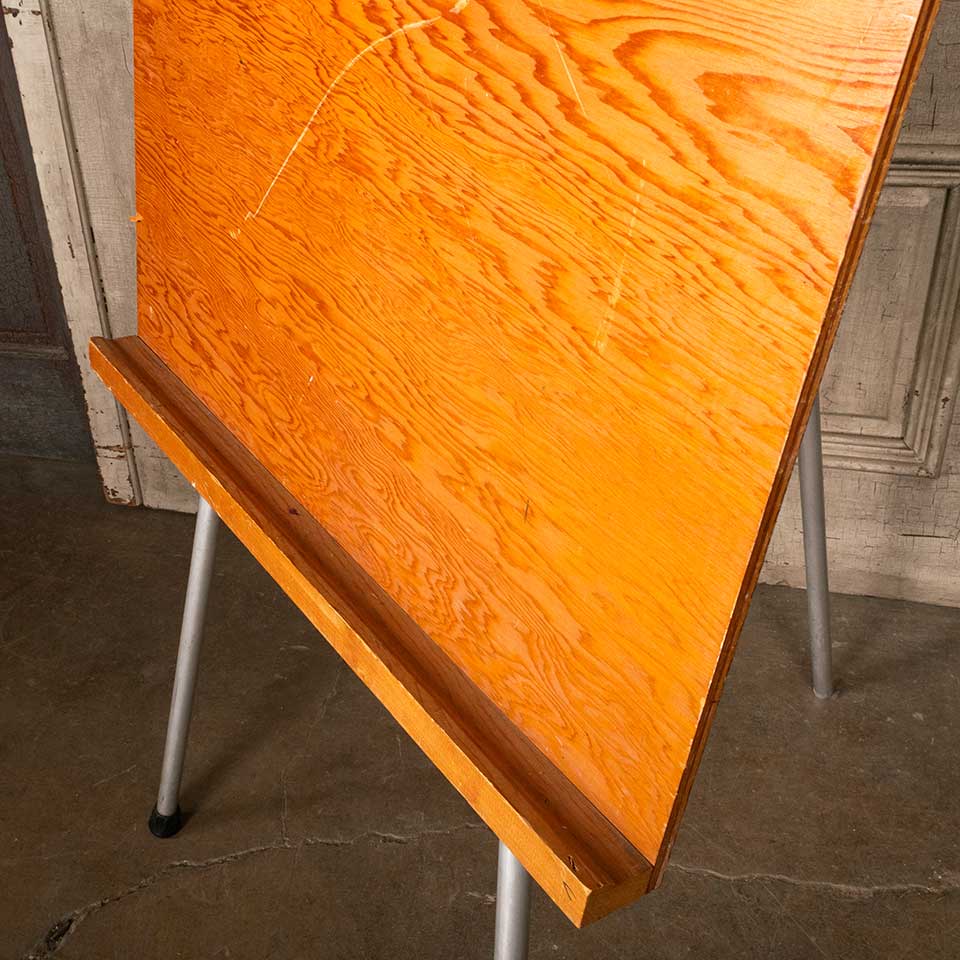 Vintage wood and metal art easel measuring approx. 30" wide x 69 1/2" tall x 23 5/8" front to back (when extended). The easel board measures approx. 30" wide x 45" tall. See photos to evaluate condition.