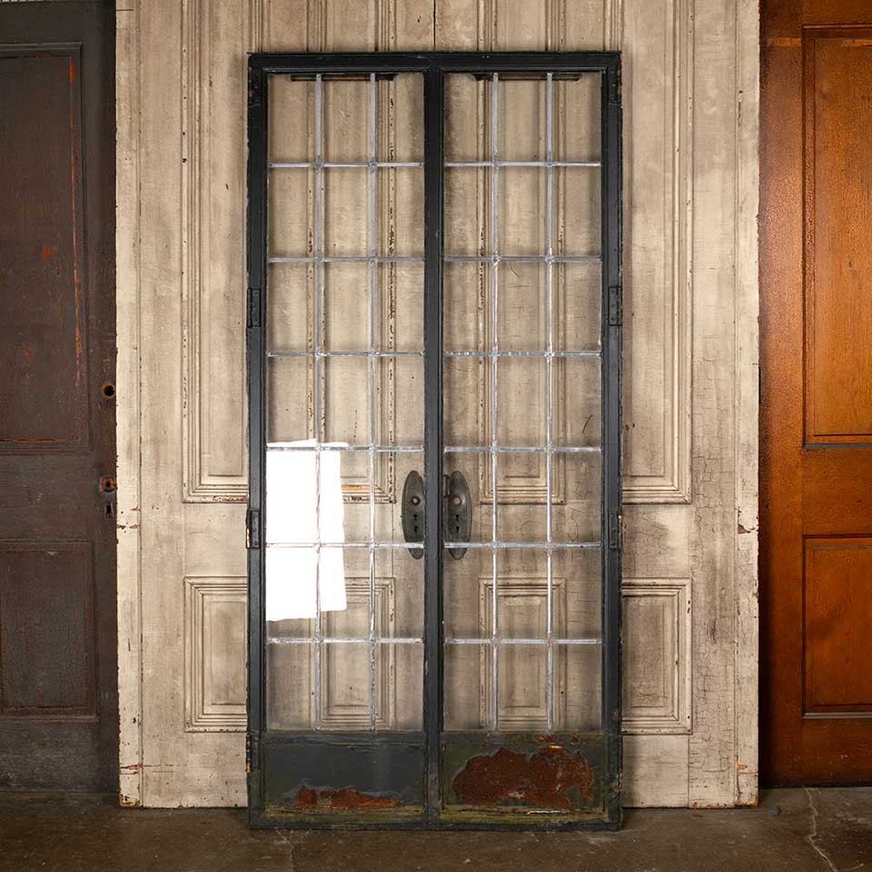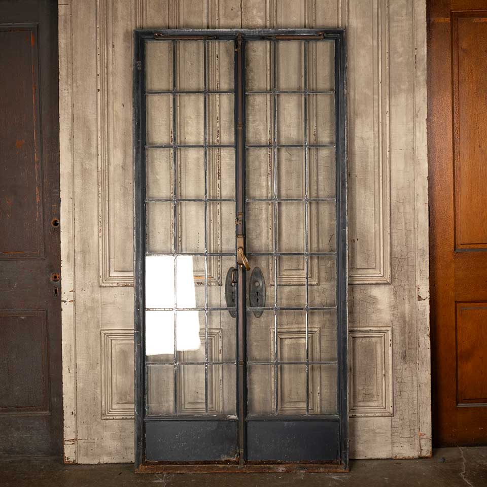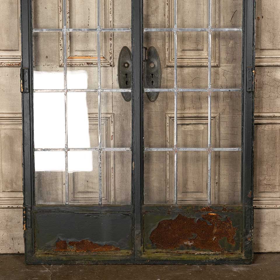 Architectural salvage antique leaded glass steel casement patio doors together with frame measuring approx. 40 3/4" x 84 1/2" tall x 1 3/4" front to back. See photos to evaluate condition.