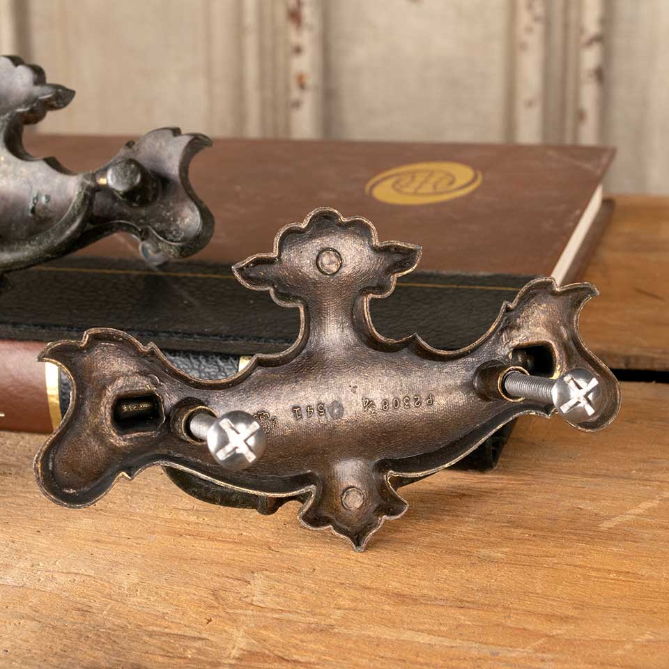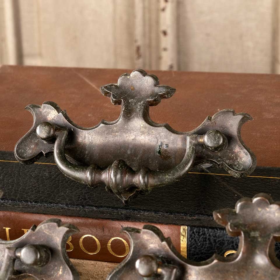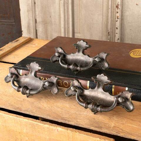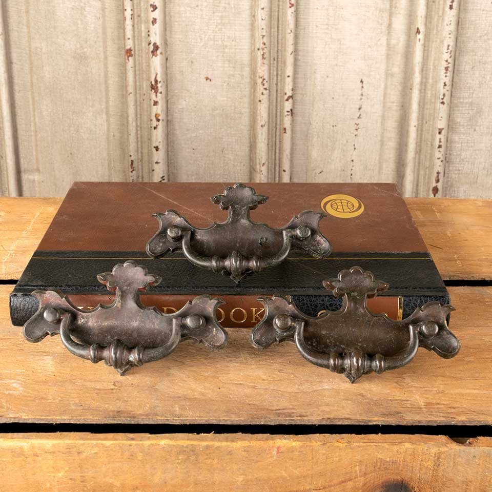 Set of 3 vintage brass furniture hardware drawer bail pulls each measuring approx. 4 1/4" wide x 2 1/2" tall x 3/4" front to back with mounting holes 2 1/4" on center. Mounting screws included. See photos to evaluate condition. Priced at $20 for the set.