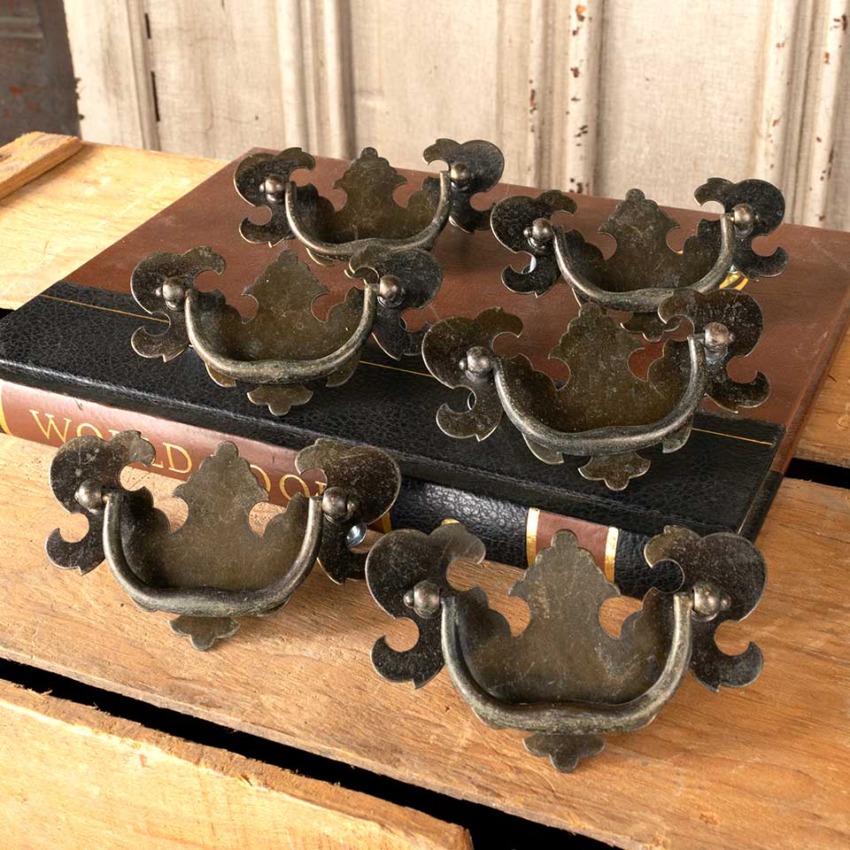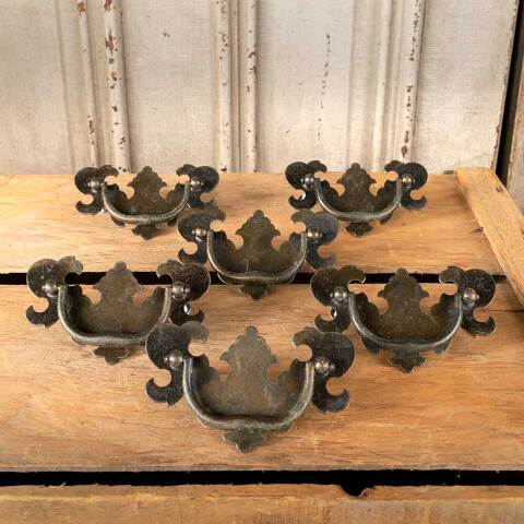 Set of six vintage metal and brass Chippendale furniture hardware drawer bail pulls each measuring approx. 3 3/4" wide x 2 1/4" tall x 5/8" front to back with mounting holes measuring 2 1/2" on center. Mounting screws included. See photos to evaluate condition. Priced at $25 for the set.