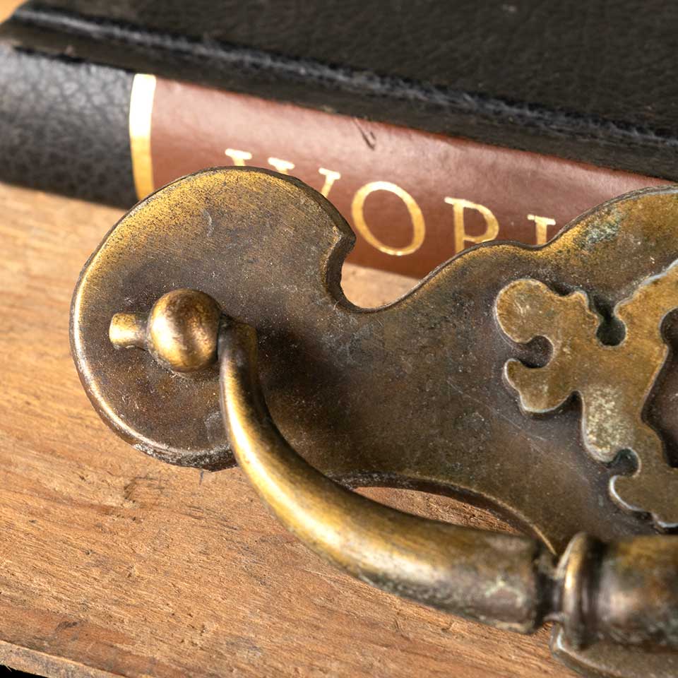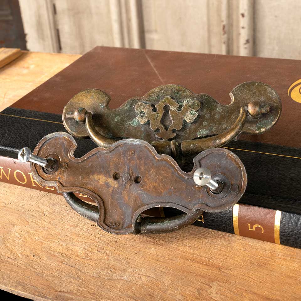 Pair of vintage brass furniture hardware drawer bail pulls with a keyhole motif each measuring approx. 5 1/8" wide x 2" tall x 3/4" front to back with mounting holes 4" on center. Mounting screws included. See photos to evaluate condition. Priced at $15 for the pair.