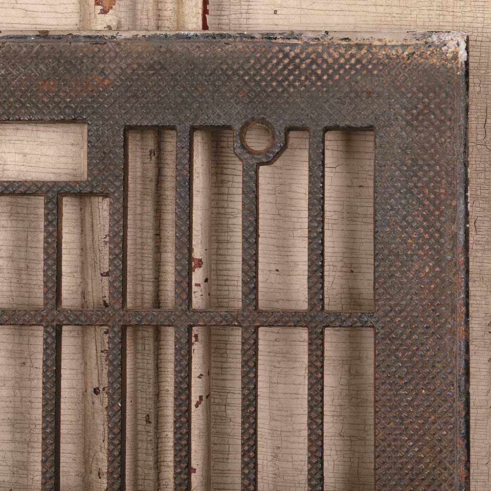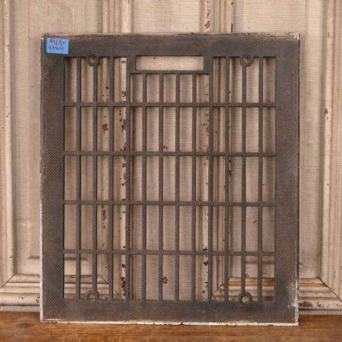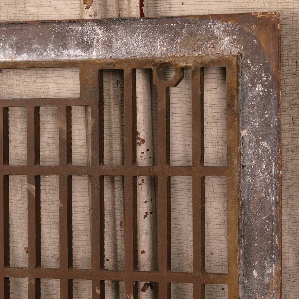 Architectural salvage antique cast iron heat grate floor vent cover measuring approx. 14" x 16" (insert dimensions) and 16 1/4" x 18 1/4" (overall dimensions). There are no louvers with this heat grate. See photos to evaluate condition.