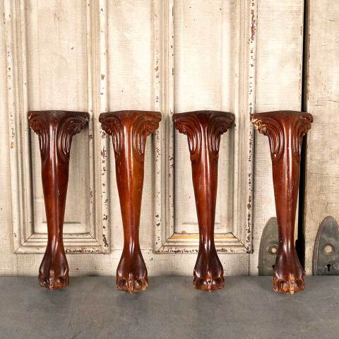 Set of four salvaged ball and claw wood furniture legs each measuring approx. 6" wide x 16 1/2" tall x 4 1/4" front to back. See photos to evaluate condition. Priced at $95 for the set of four.