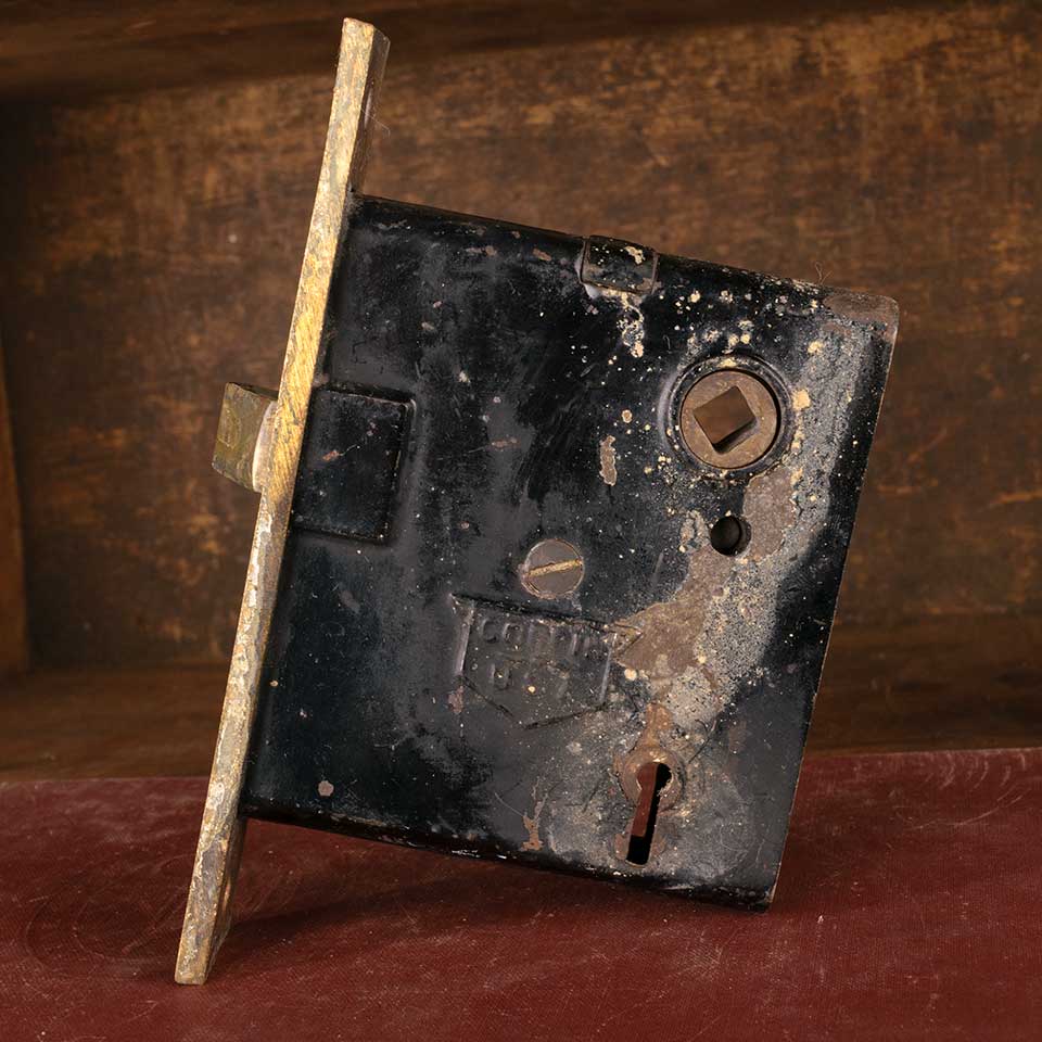 Architectural salvage antique brass and cast iron Corbin USA reversible interior door mortise latch lock hardware with skeleton keyhole deadbolt. Measurements: faceplate 1" wide x 5 3/4" tall x 1/8" thick and body 5/8" wide x 3 3/4" tall x 3 1/4 front to back with a 2 1/2" backset. Spindle and keyholes measure 2 1/2" on center. Key and strike plate NOT included. Color and condition vary, see photos to evaluate. Priced at $20/each.