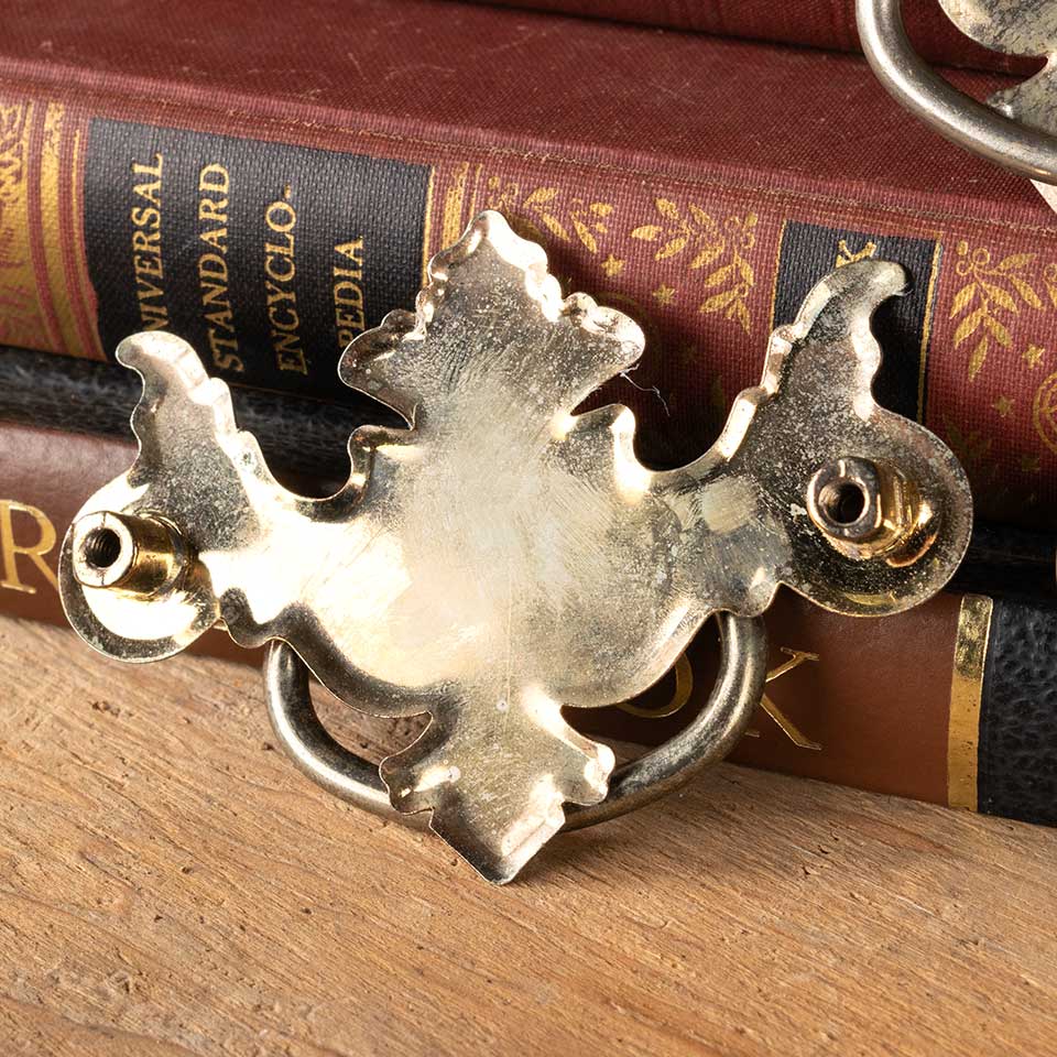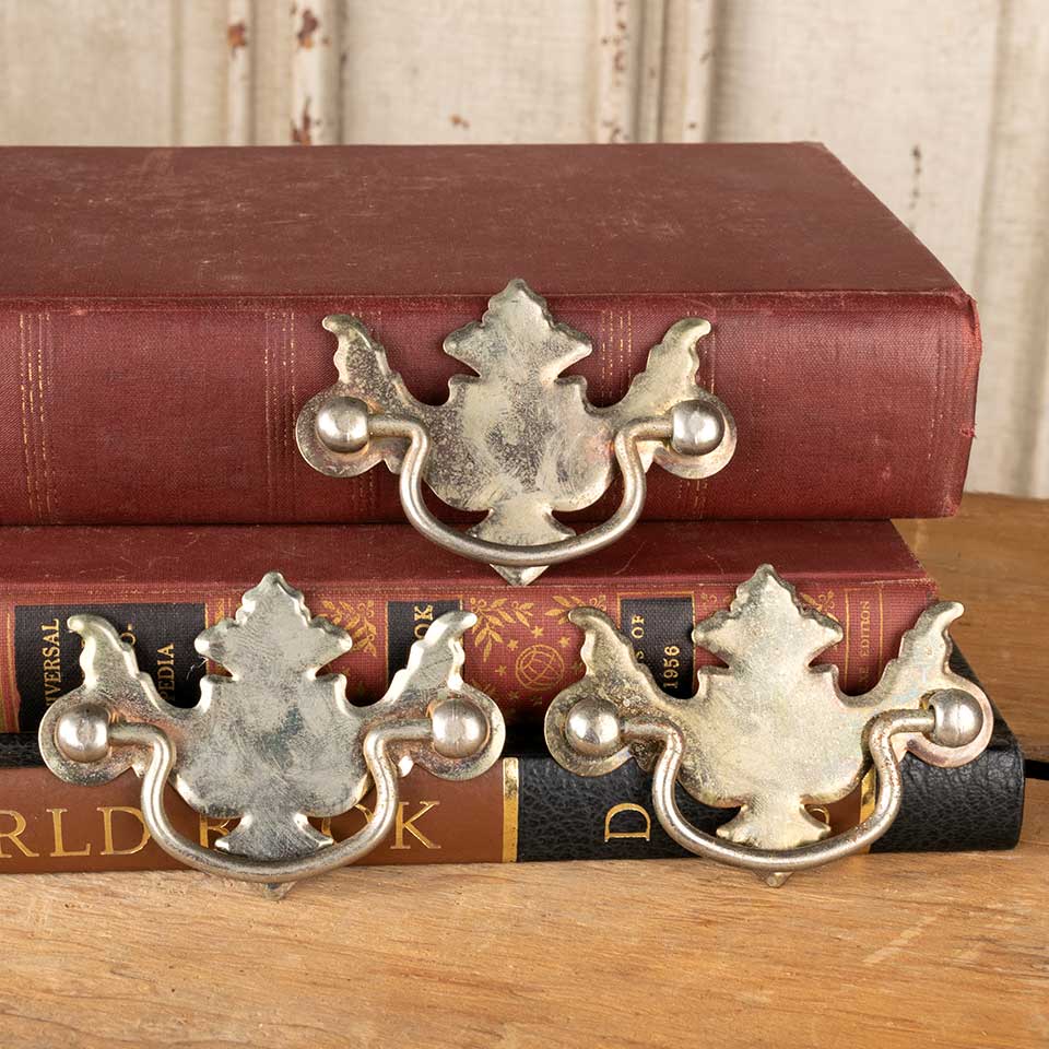 Set of three vintage metal Chippendale style furniture drawer hardware bail pulls each measuring approx. 3 1/4" wide x 2 1/4" tall x 3/8" front to back with mounting holes 2 1/2" on center. Mounting screws NOT included. See photos to evaluate condition. Priced at $20 for the set.